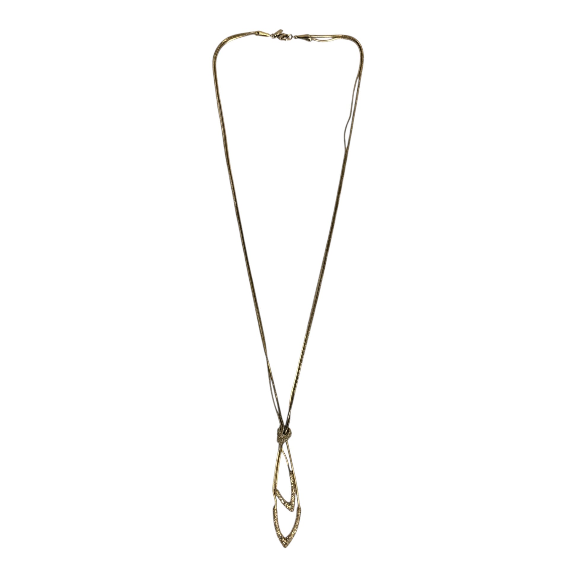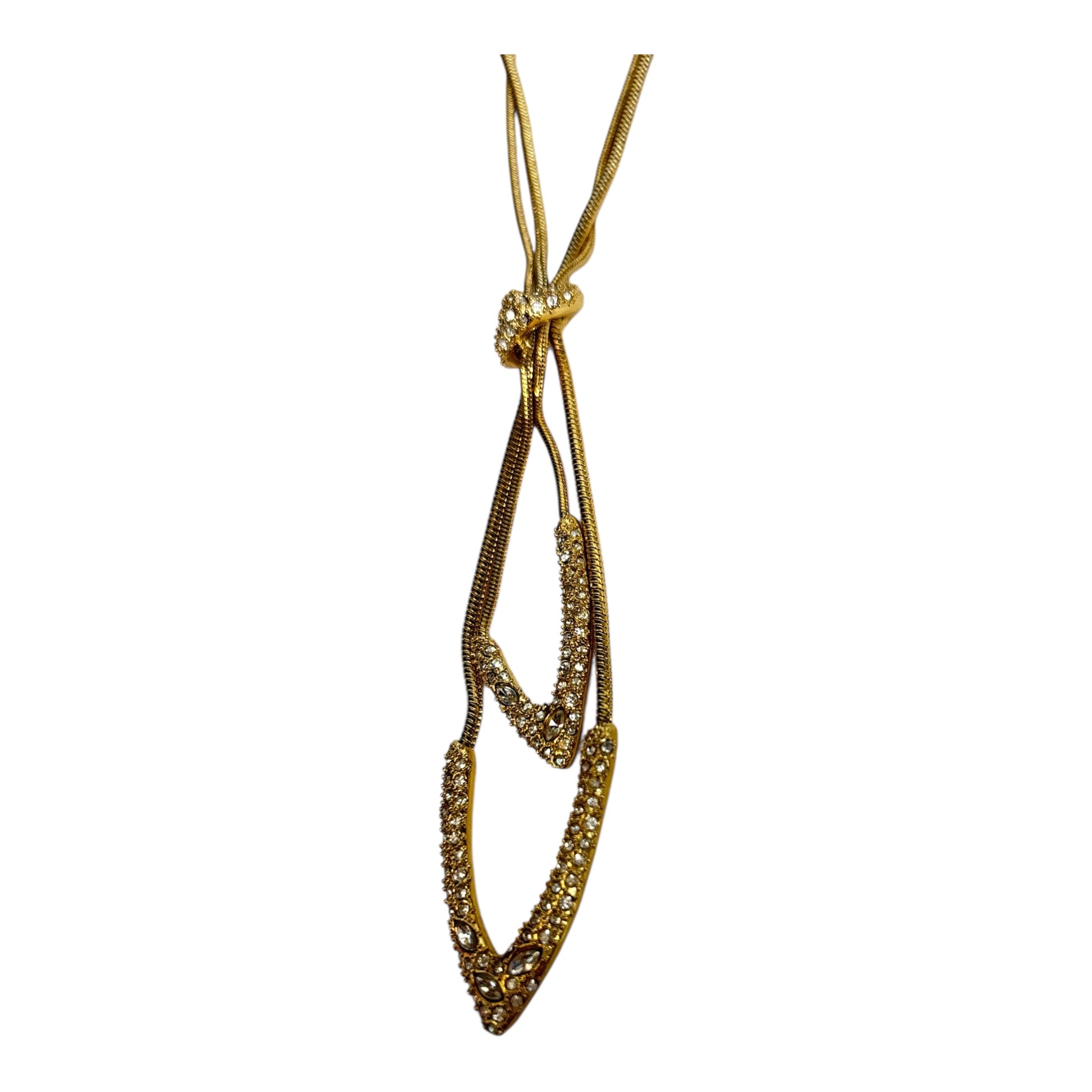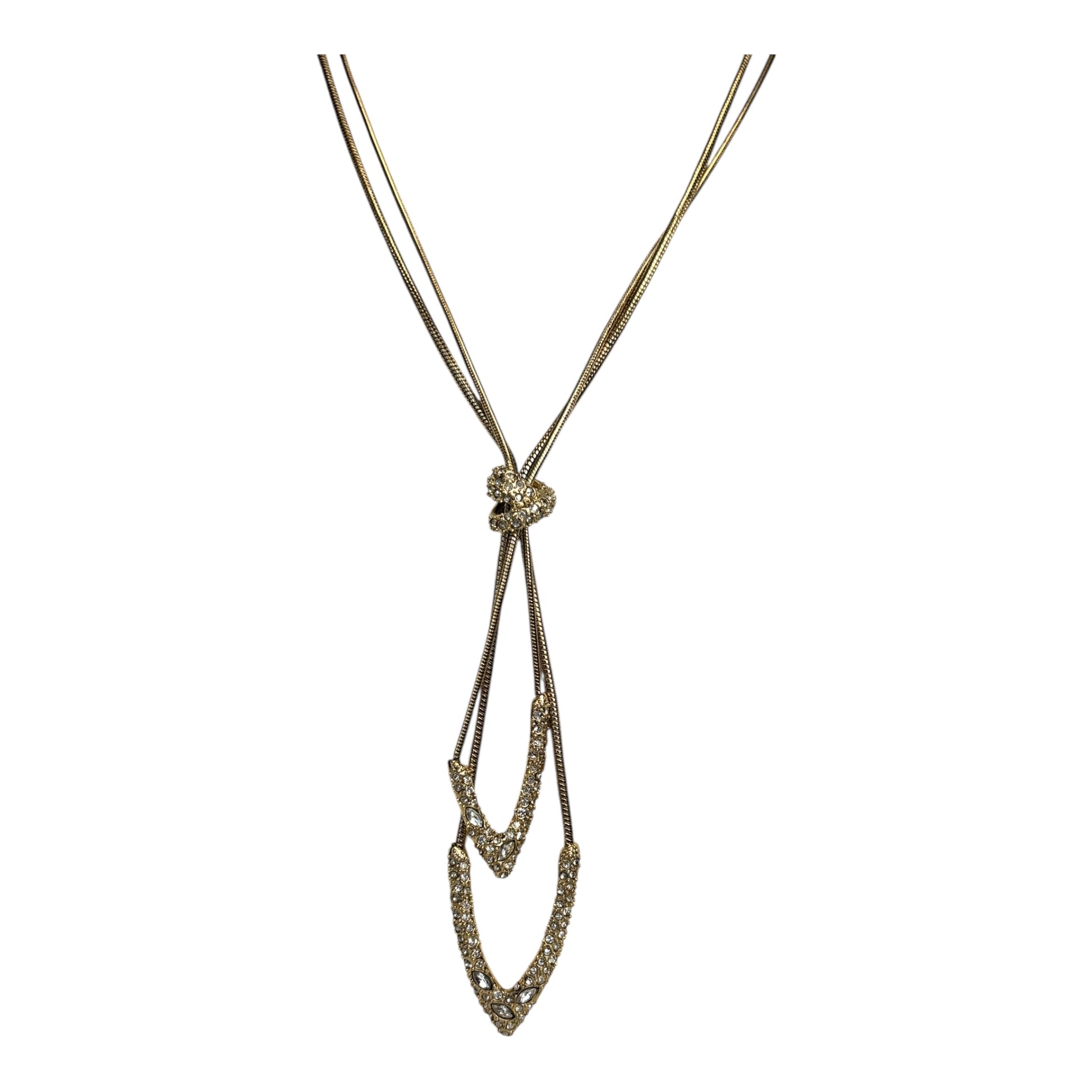 Goldtone long chain necklace has two V shaped pendants with rhinestones. Pendant portion measures 2-1/4" long x 3/4" wide. Chain measures 25-1/2" unclasped laid flat end to end