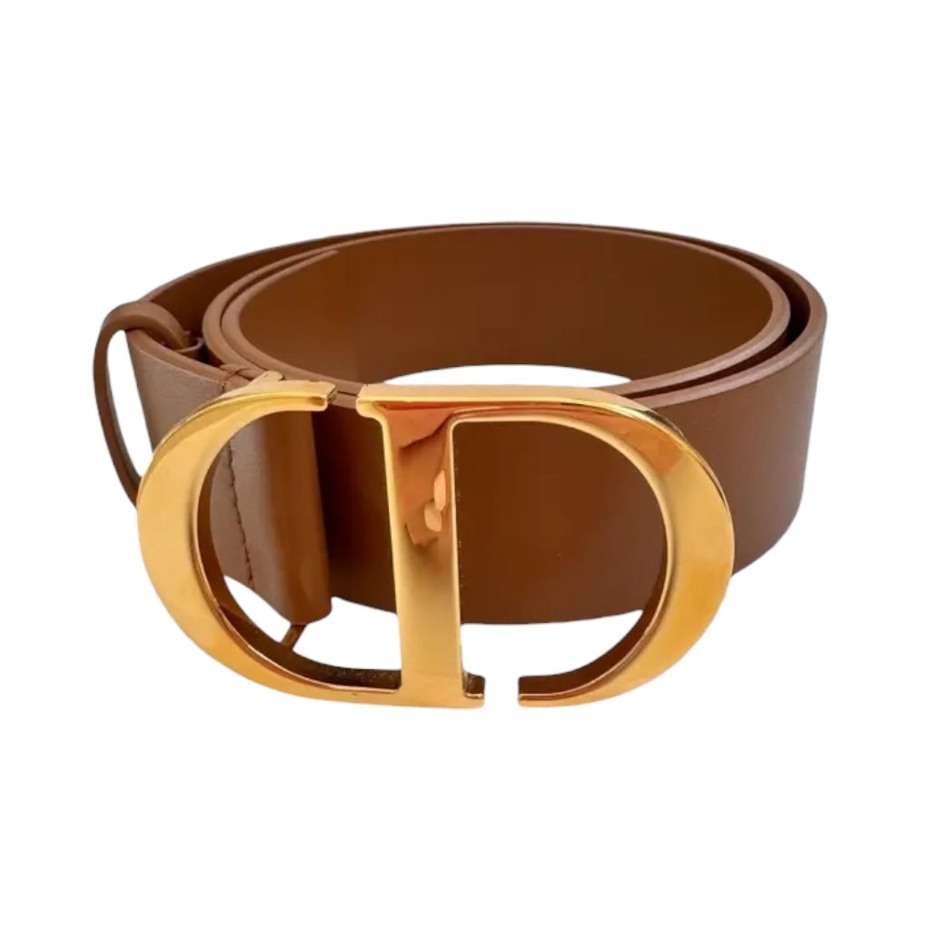 Christian Dior belt featuring a large gold-finish "CD" signature buckle and a brown leather strap.