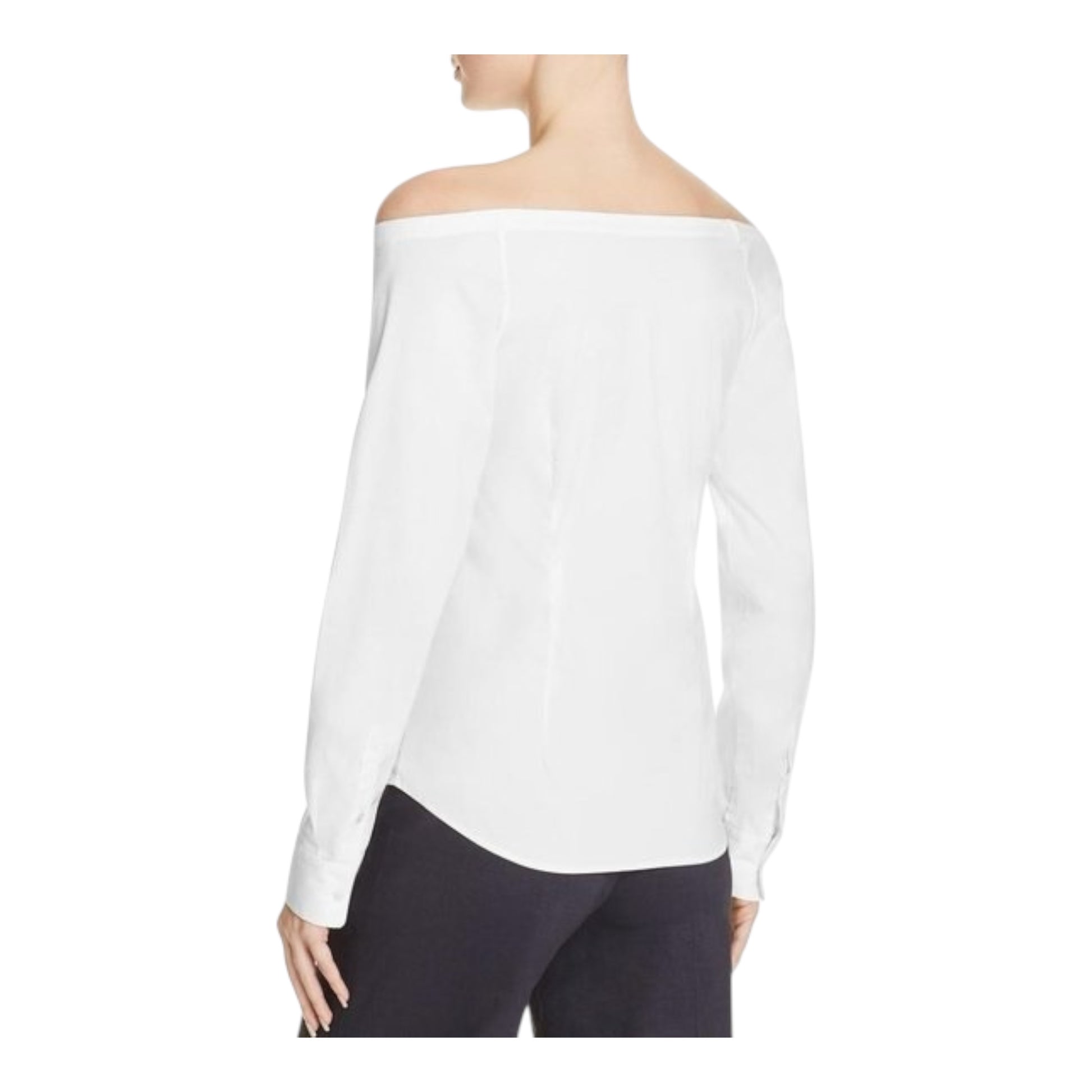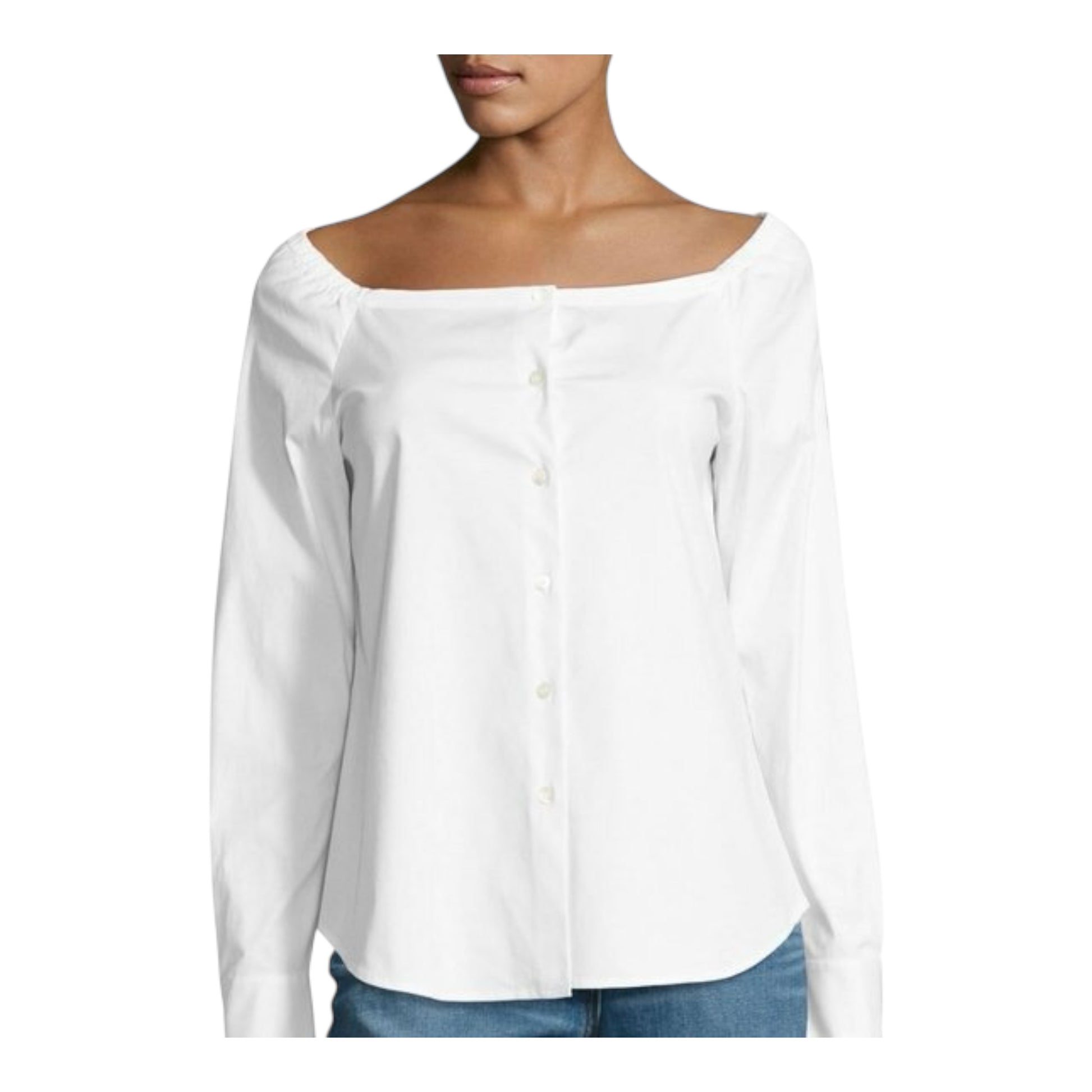Stretch shirting lends a comfortable fit to this off-shoulder Theory top. Show off your décolletage with an off-the-shoulder blouse. Button placket. Long sleeves with button cuffs. Off-the-shoulder Concealed placket front and hook and-eye clasp closure. Topstitching throughout.