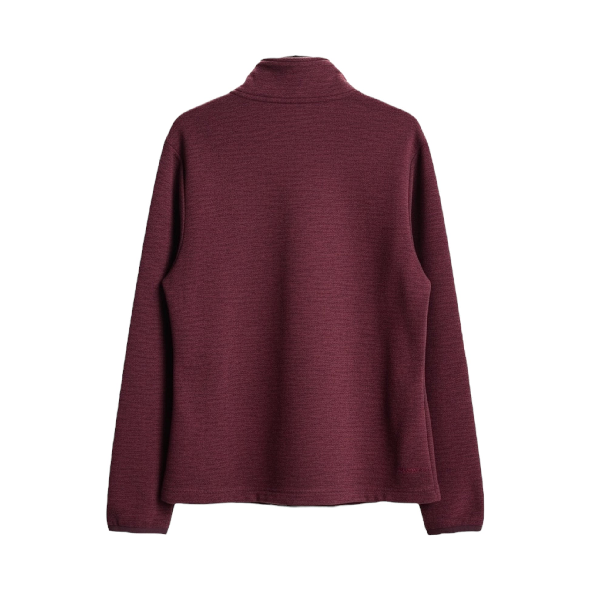 maroon-colored, full-zip fleece jacket. The jacket has a stand-up collar and two zippered pockets on the front. It is made of a soft, polyester fleece material. The jacket's design includes a full-zip front and long sleeves, making it a versatile layer for cool weather.