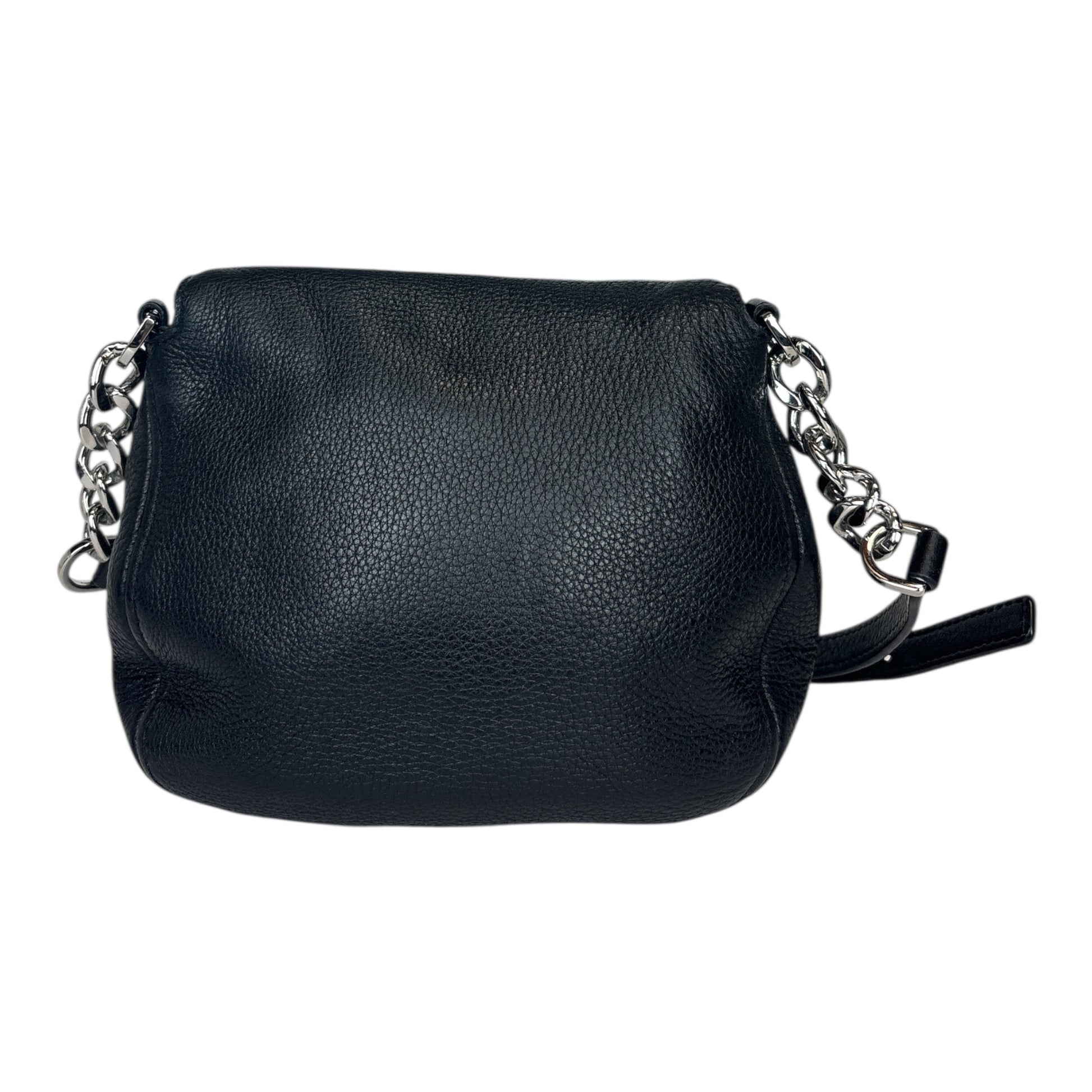 Black Pebbled Leather. Gold Hardware Crossbody strap of Chain and Leather Front flap Snap closue. Front Flap zips open to a deep pocket for extra storage.1 Interior Black Sateen Monogram fabric 1 Zippered pocket Measures 8.5"w 7'h Adjustable crossbody strap 25"-28"