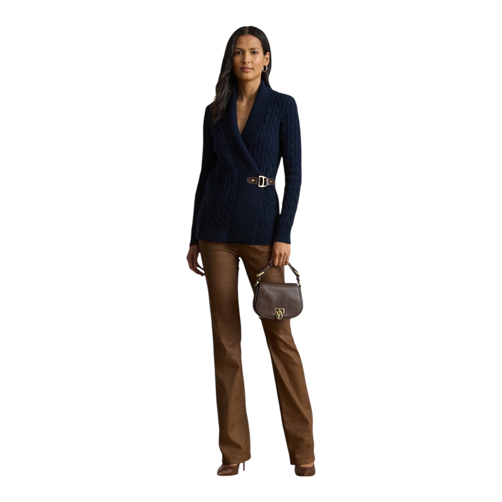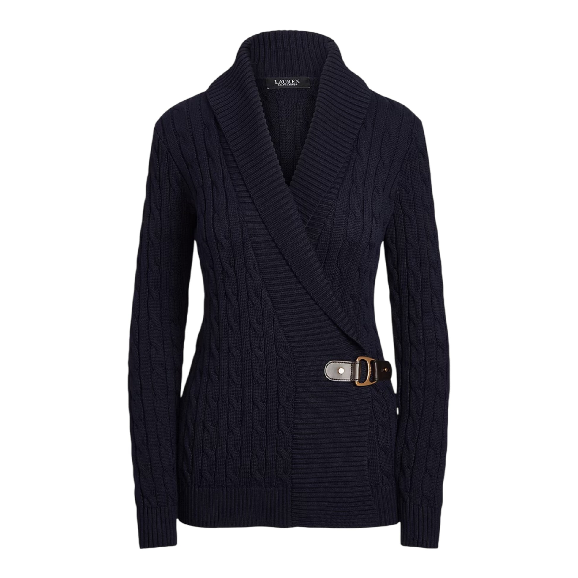 • Ribbed shawl collar. Open front with faux-leather buckle closure. "LRL"-engraved buckle.