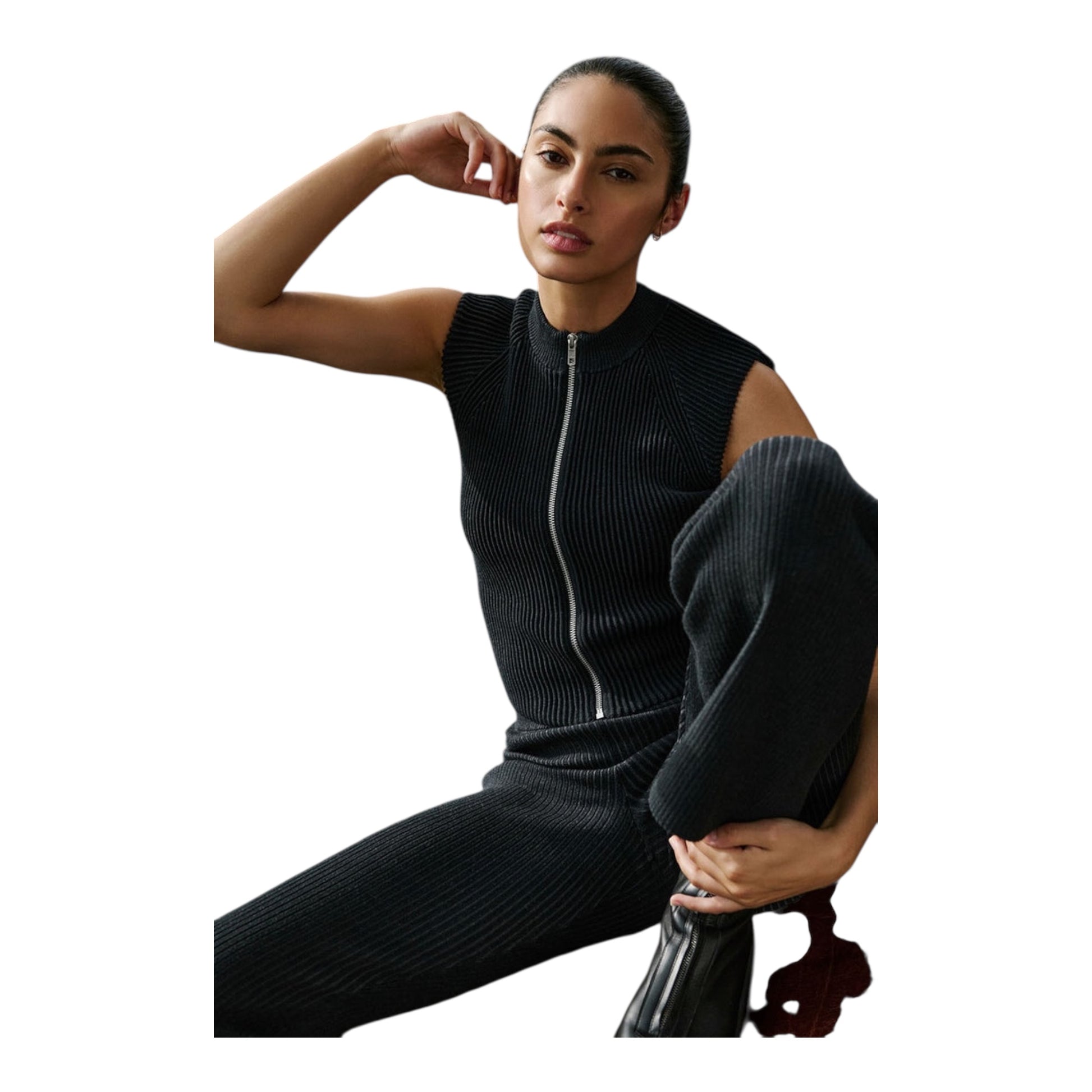 Keep your style effortlessly sleek with the Denim Knit Sleeveless Top. With its full zipper detail, your style options are endless. Wear it fully zipped for a chic look or unzip it a few inches when you have plans to go out. In the mood for a fully ribbed moment? Pair it with the matching pants and cloche for a head-to-toe look.