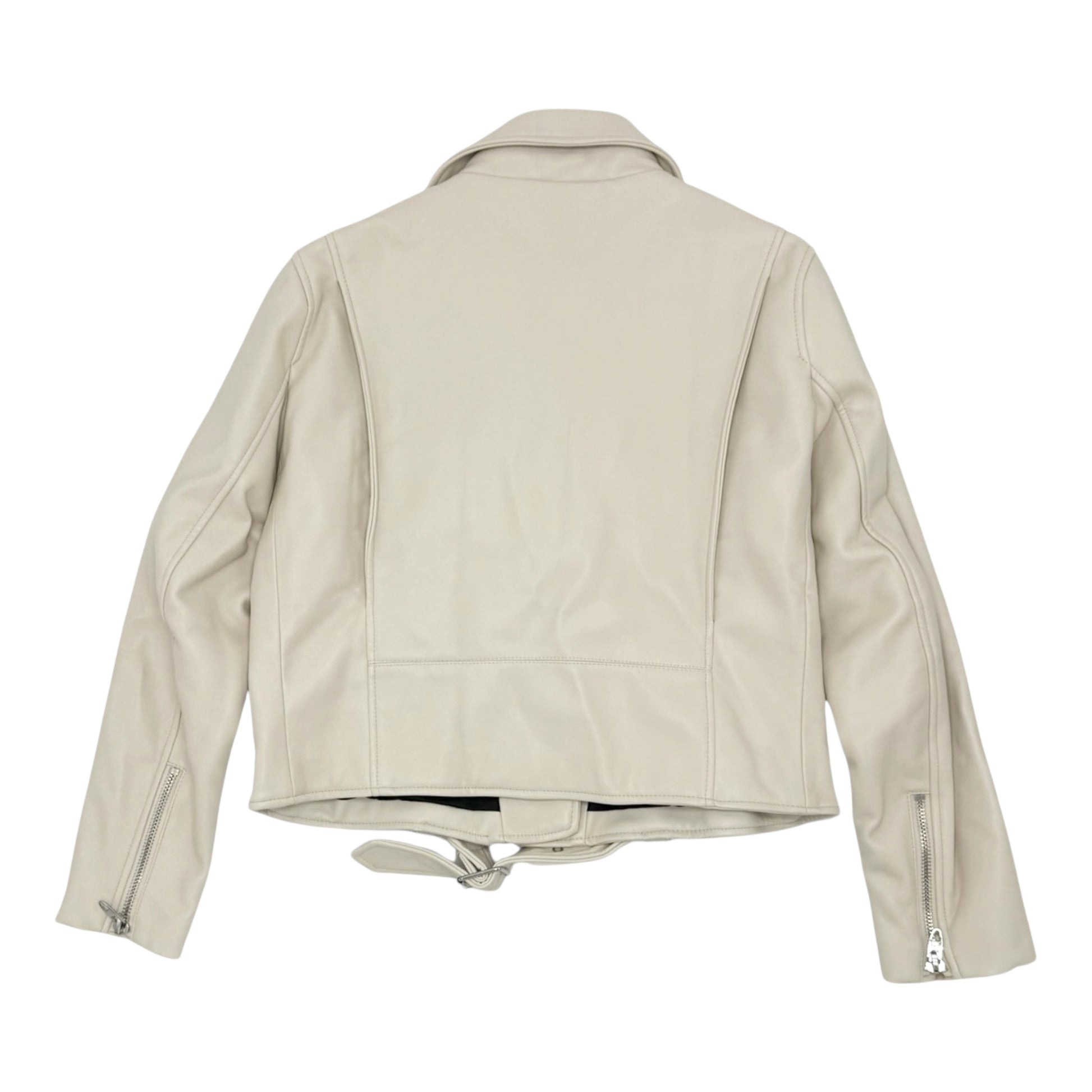 • Colour and Material: The jacket is a cream or nude colour and made of faux leather.