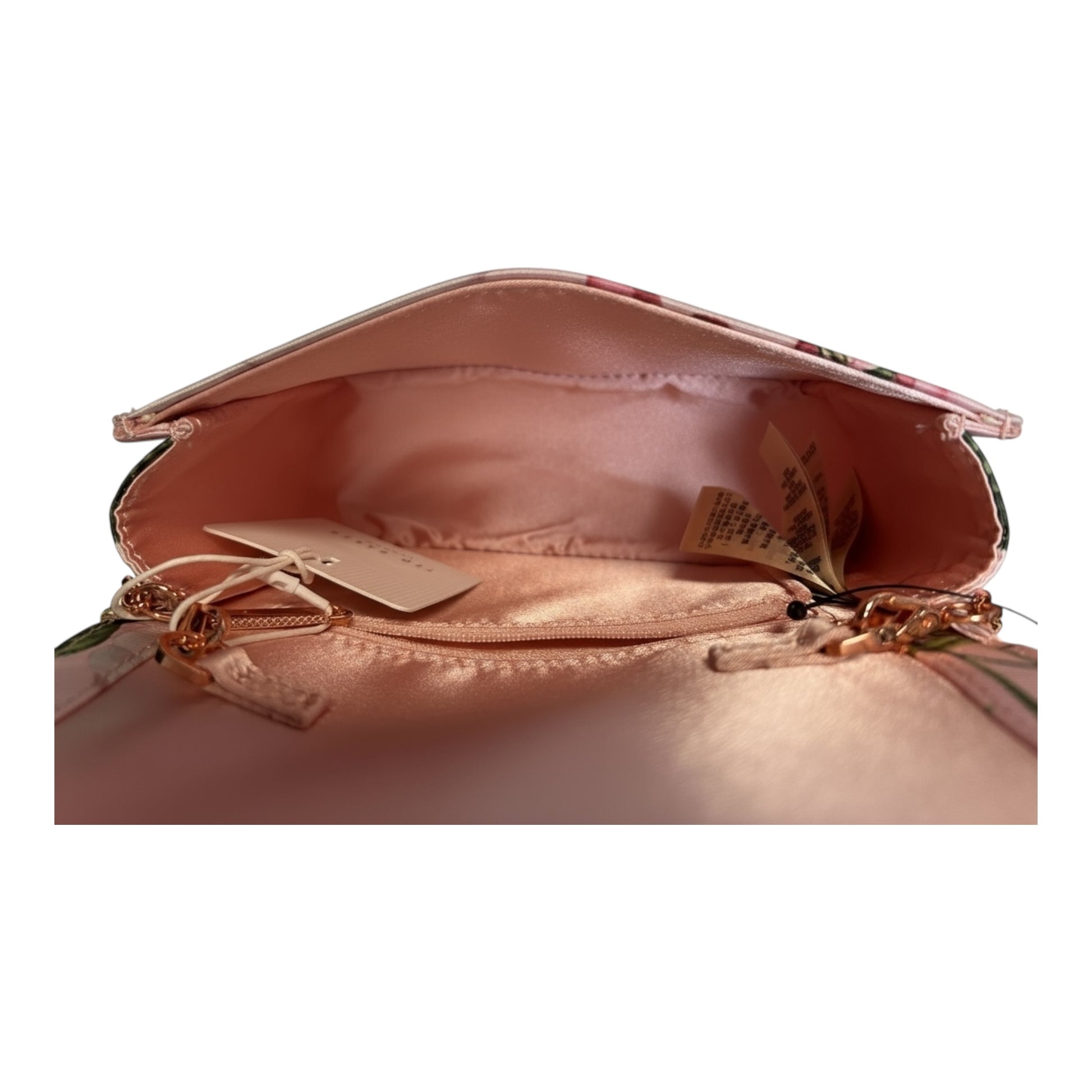 • Details: A small, light pink bow with gold-tone hardware is situated on the front, acting as the clasp mechanism. The bag appears to have a slight sheen or metallic finish on the fabric.