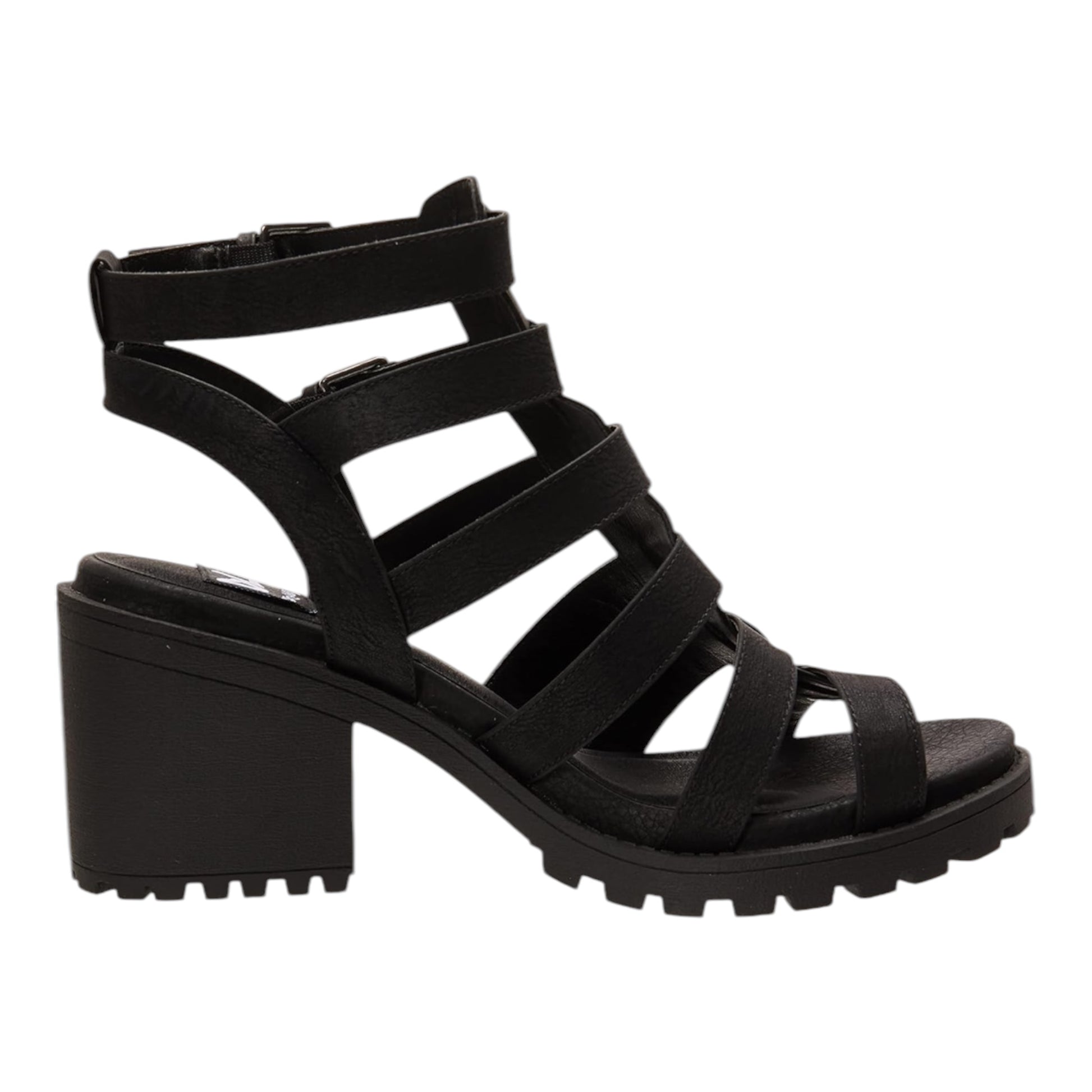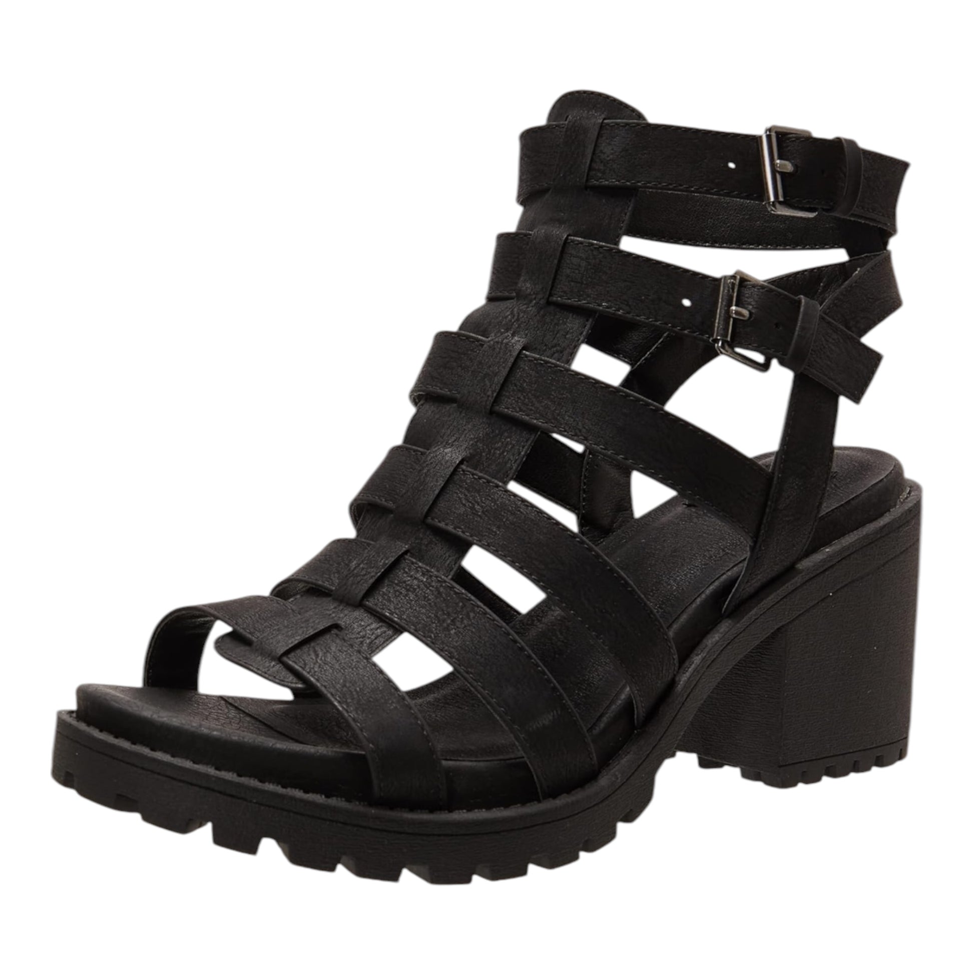 Open toe caged sandal with a chunky block heel, lug sole, and dual ankle straps.