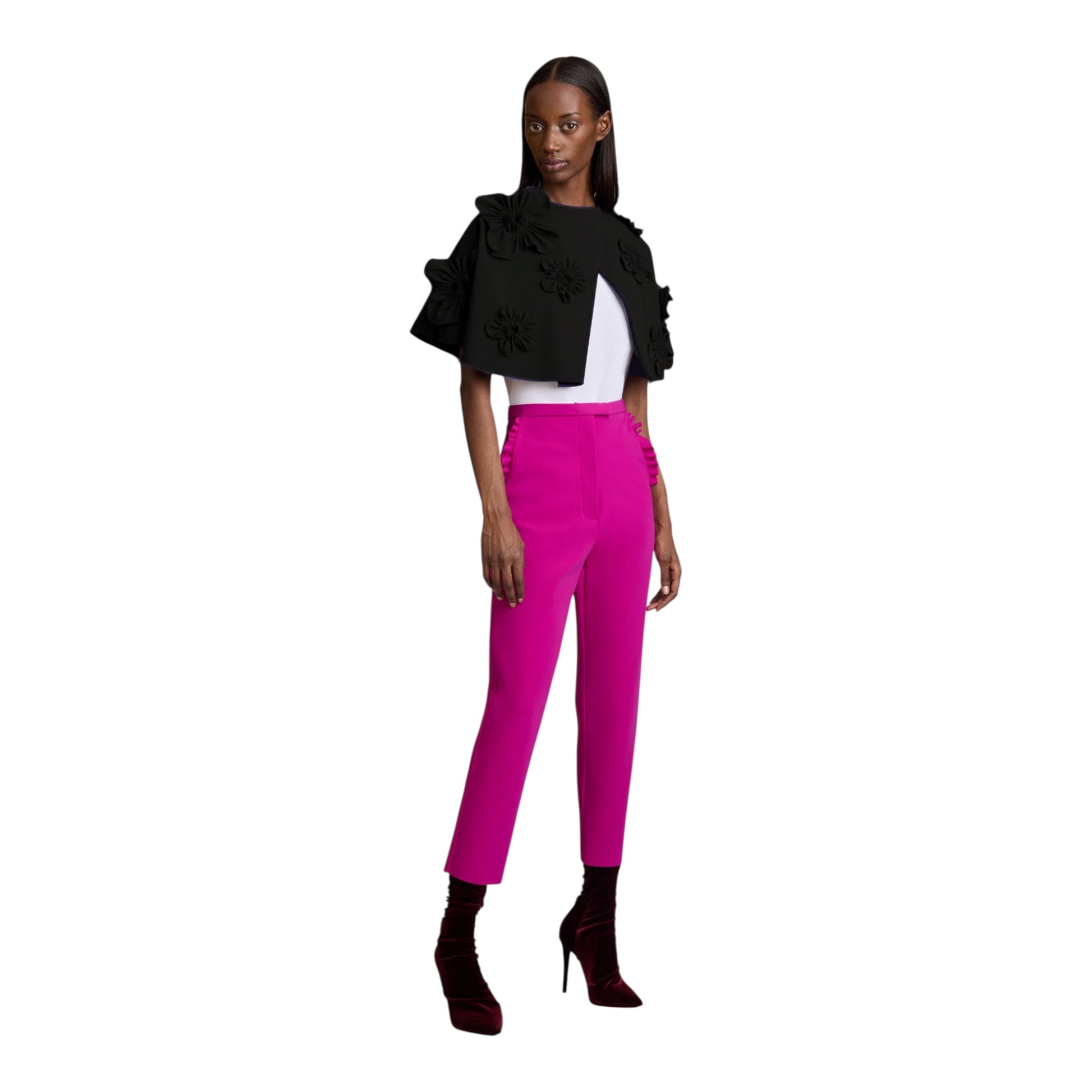 This sculptural capelet delivers signature Greta Constantine drama with dimensional floral appliqués and a modern, structured silhouette. Its crisp, open-front design layers effortlessly over tailored separates or evening pieces, adding bold texture, volume, and an elevated finishing touch to any contemporary wardrobe.