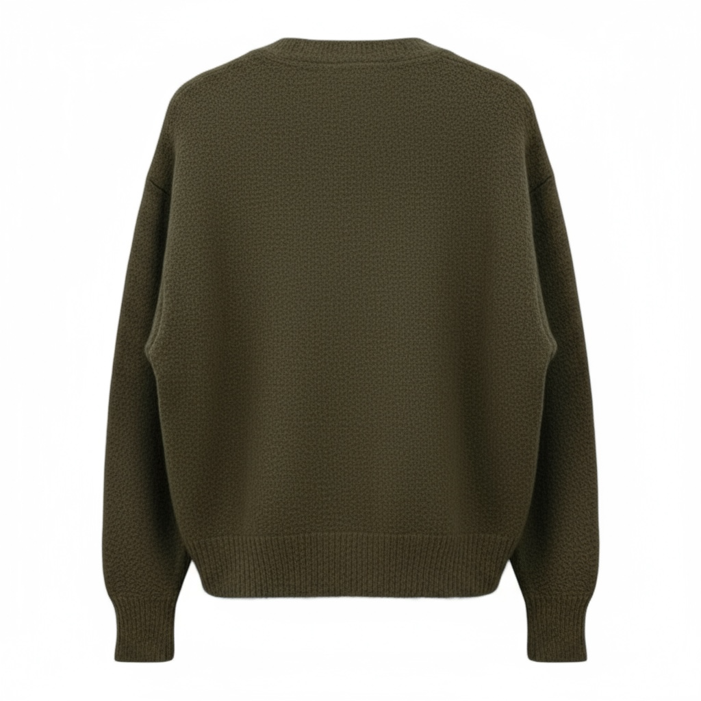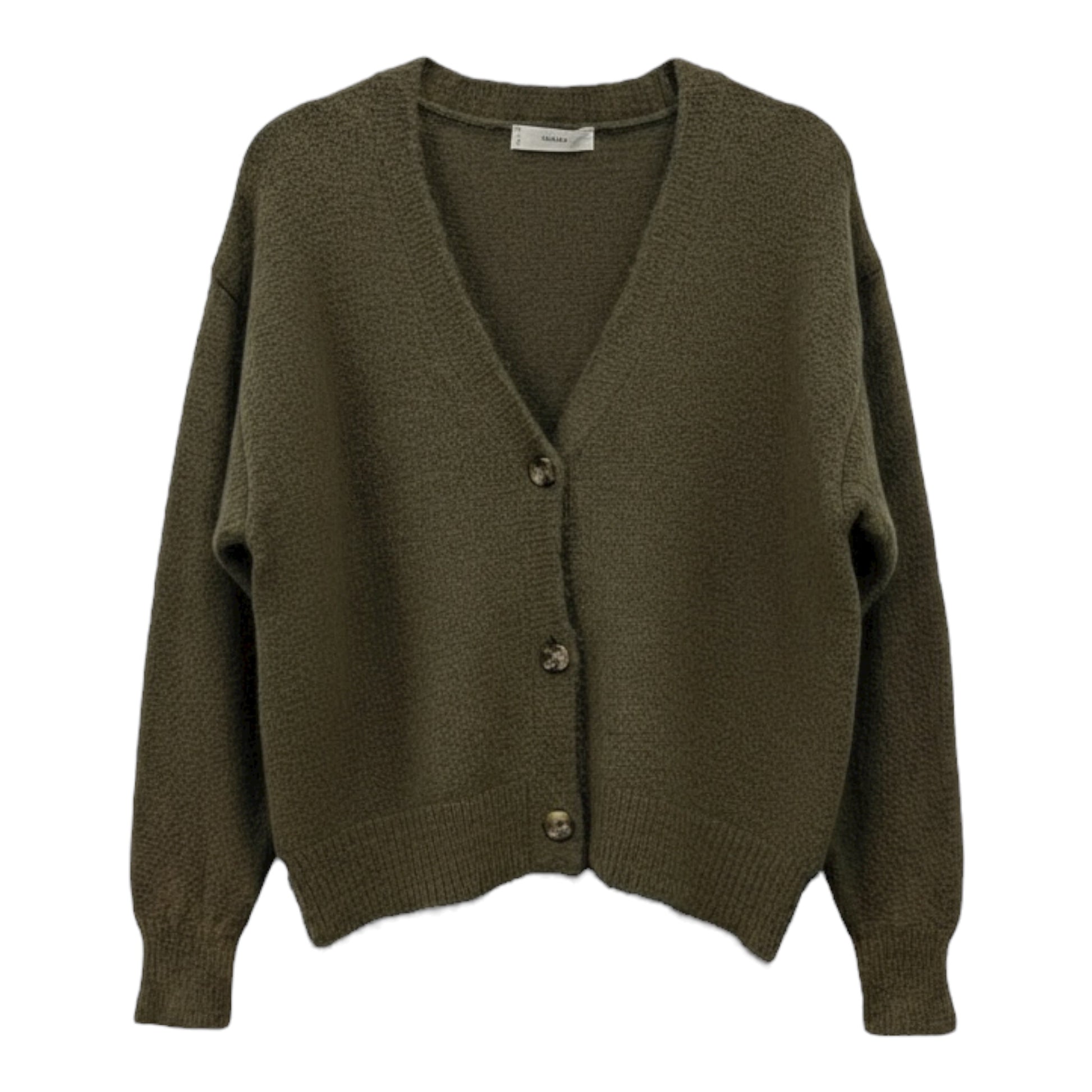 olive green knit cardigan with three button closure, cuffed hem and sleeves,