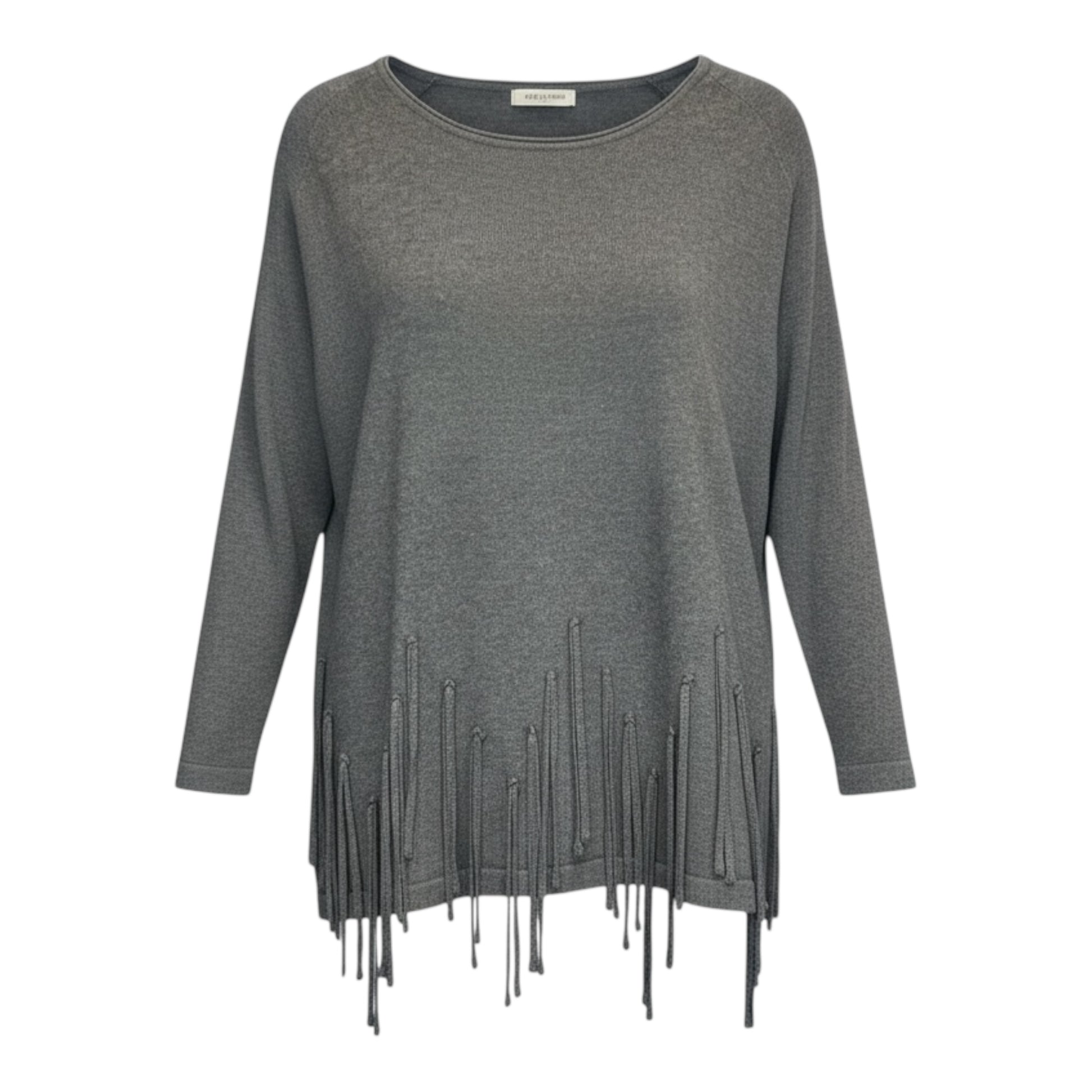 • Design: The sweater features long sleeves, a round neckline, and is embellished with fringes at the bottom hem.
