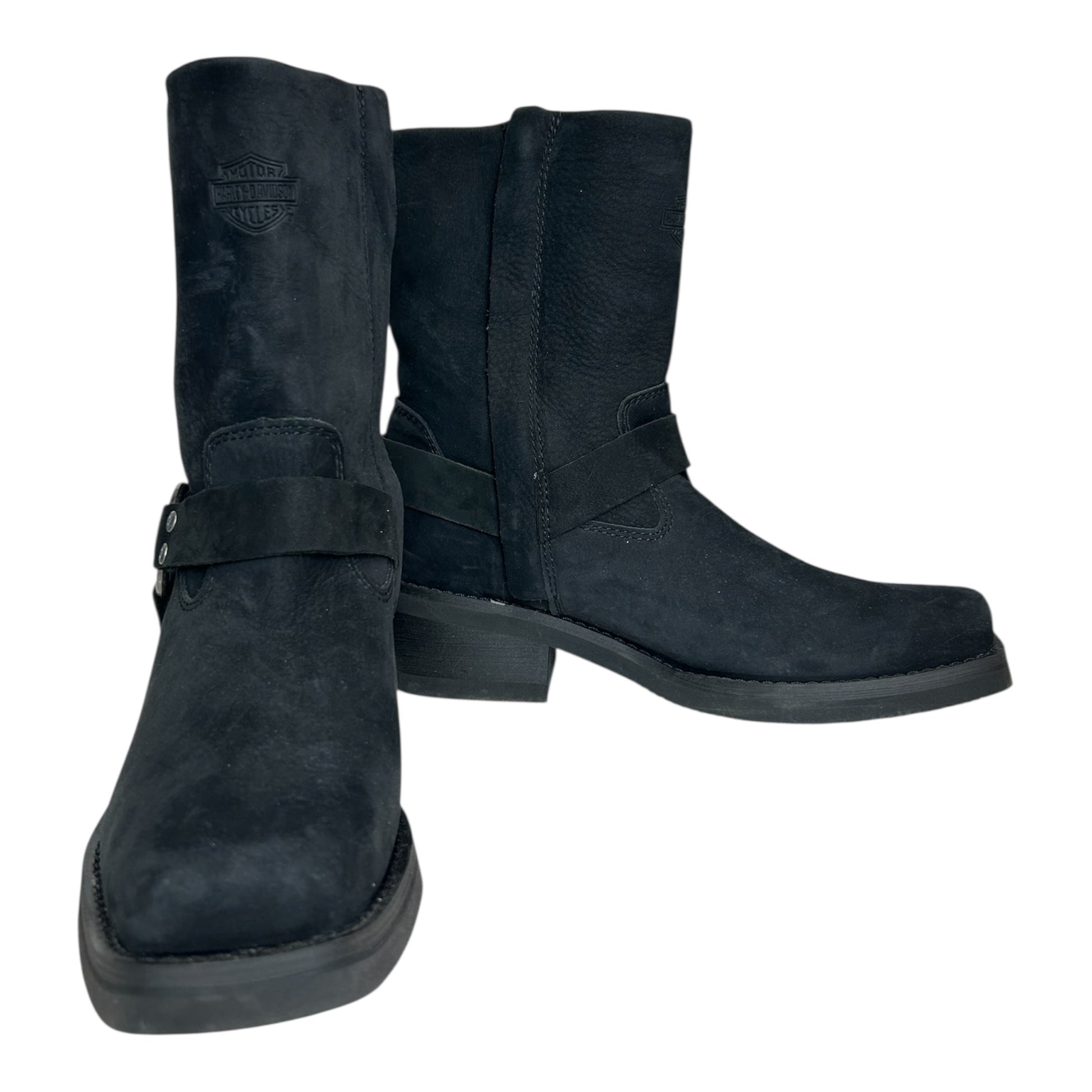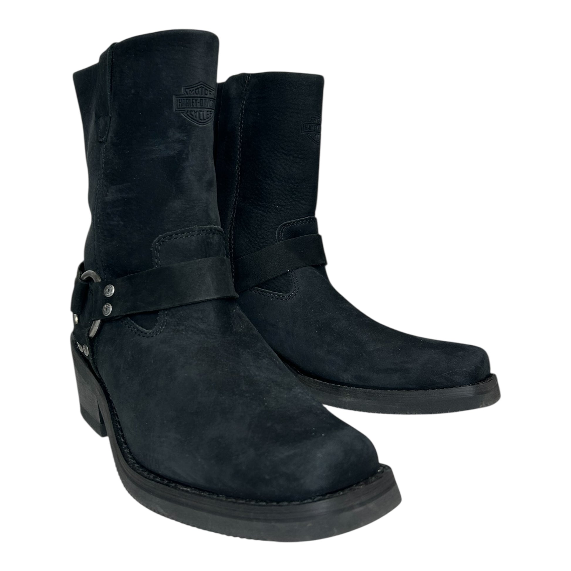 • Design The boots feature the classic O-ring harness style with a strap and metal hardware. They have a squared toe and a blocked heel.
