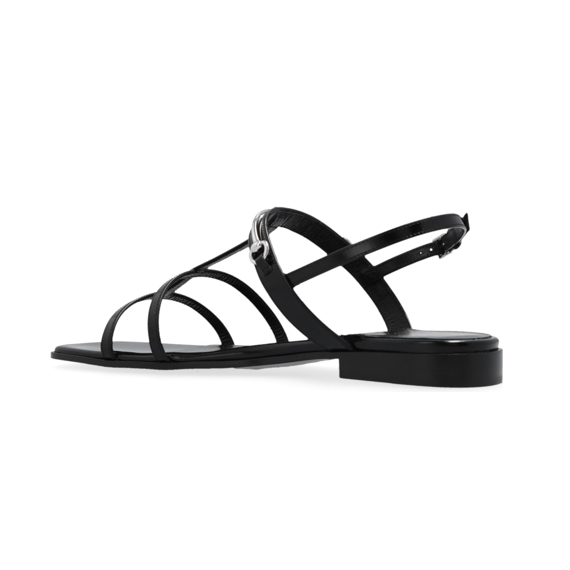 Black sandals from Gucci. Made from leather with a square toe, this model sits on a black leather sole and features an adjustable buckle strap and the brand's signature silver-tone horsebit hardware on the front.