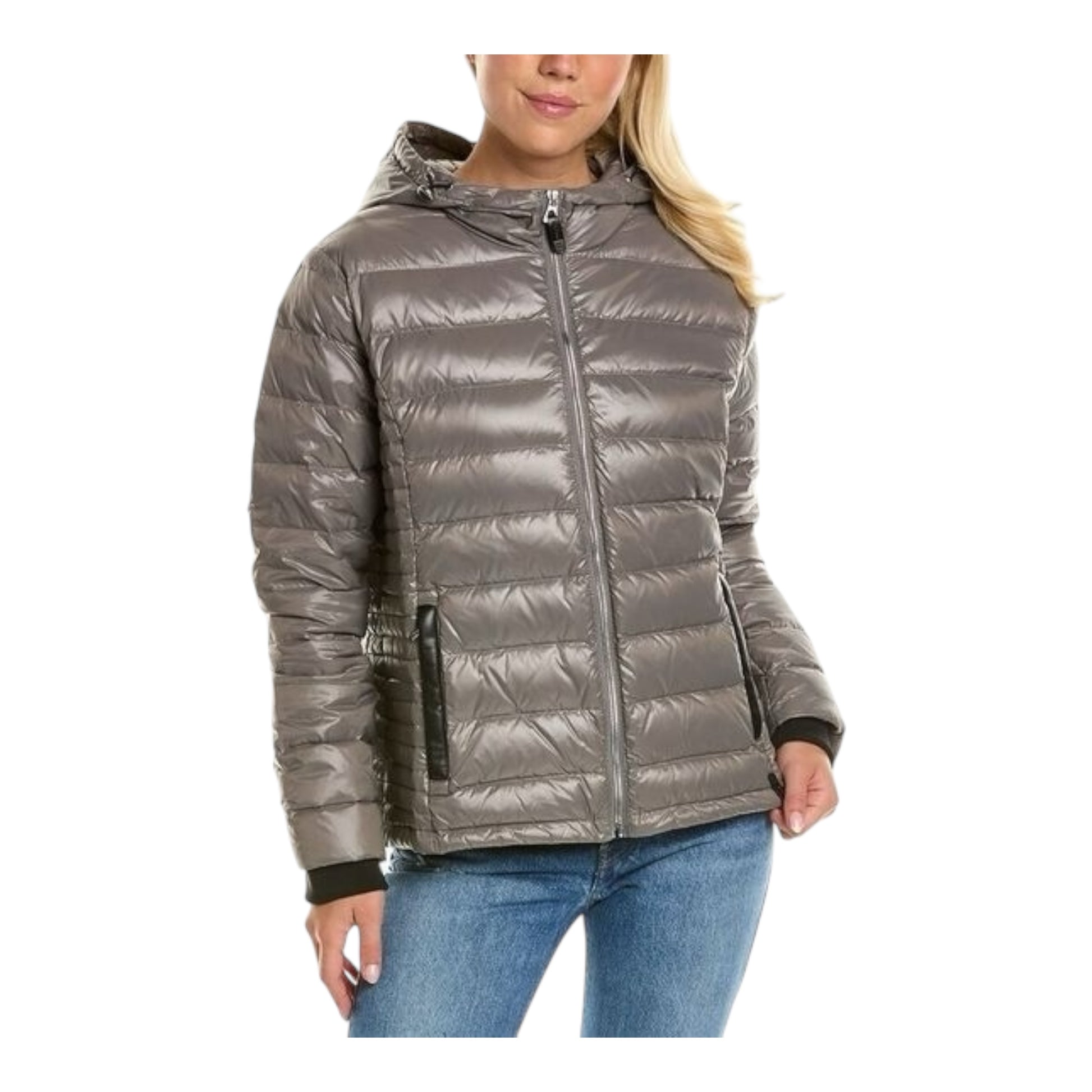 Color/pattern: grey Approximately 25in from shoulder to hem Model is 5'10 and is wearing a size x-large. Measurements may vary slightly by size. Design details: quilted construction, hooded back, two front zippered pockets and contrast inner cuffs Zipper front Lightweight Shell & Lining: 100% nylon Fill: 90% duck down, 10% feathers Trim 1: 100% cow leather Trim 2: 82% nylon, 18% elastane Dry clean only Imported