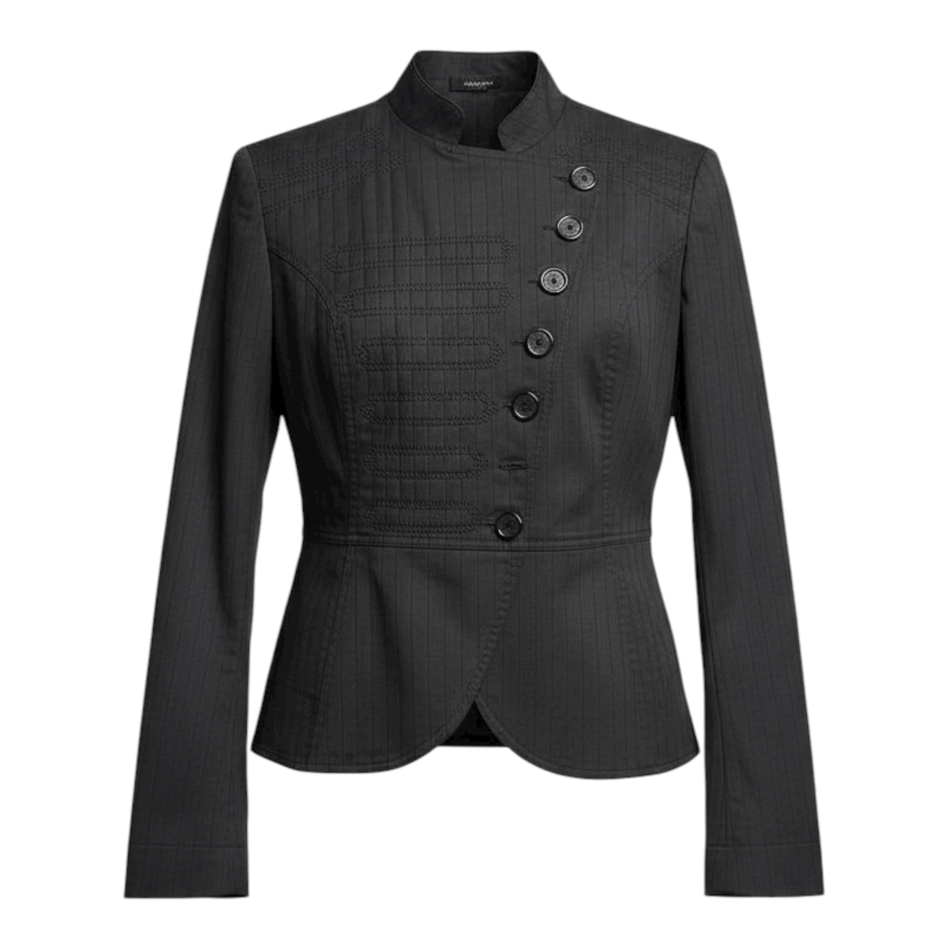 dark-colored, pinstriped jacket hanging on a black hanger. The jacket has a high, stand-up collar and an asymmetrical front closure with two rows of black buttons. The left side of the chest features a decorative pleated or ruched detail. The bottom hem of the jacket has a curved, pointed shape in the front.