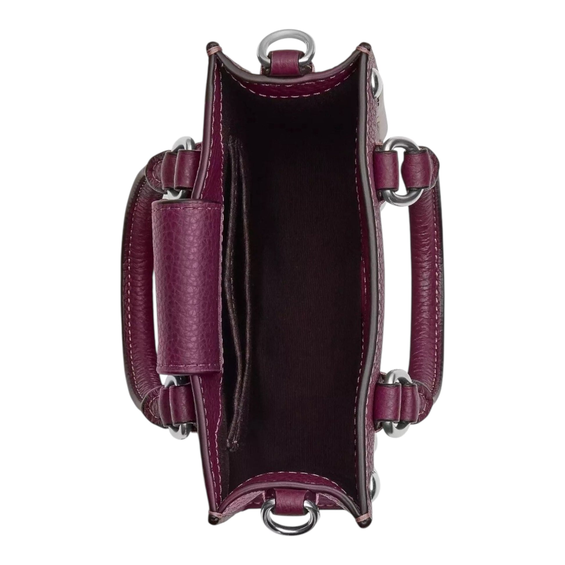 The deep berry exterior color and silver hardware give it a sleek and sophisticated look.