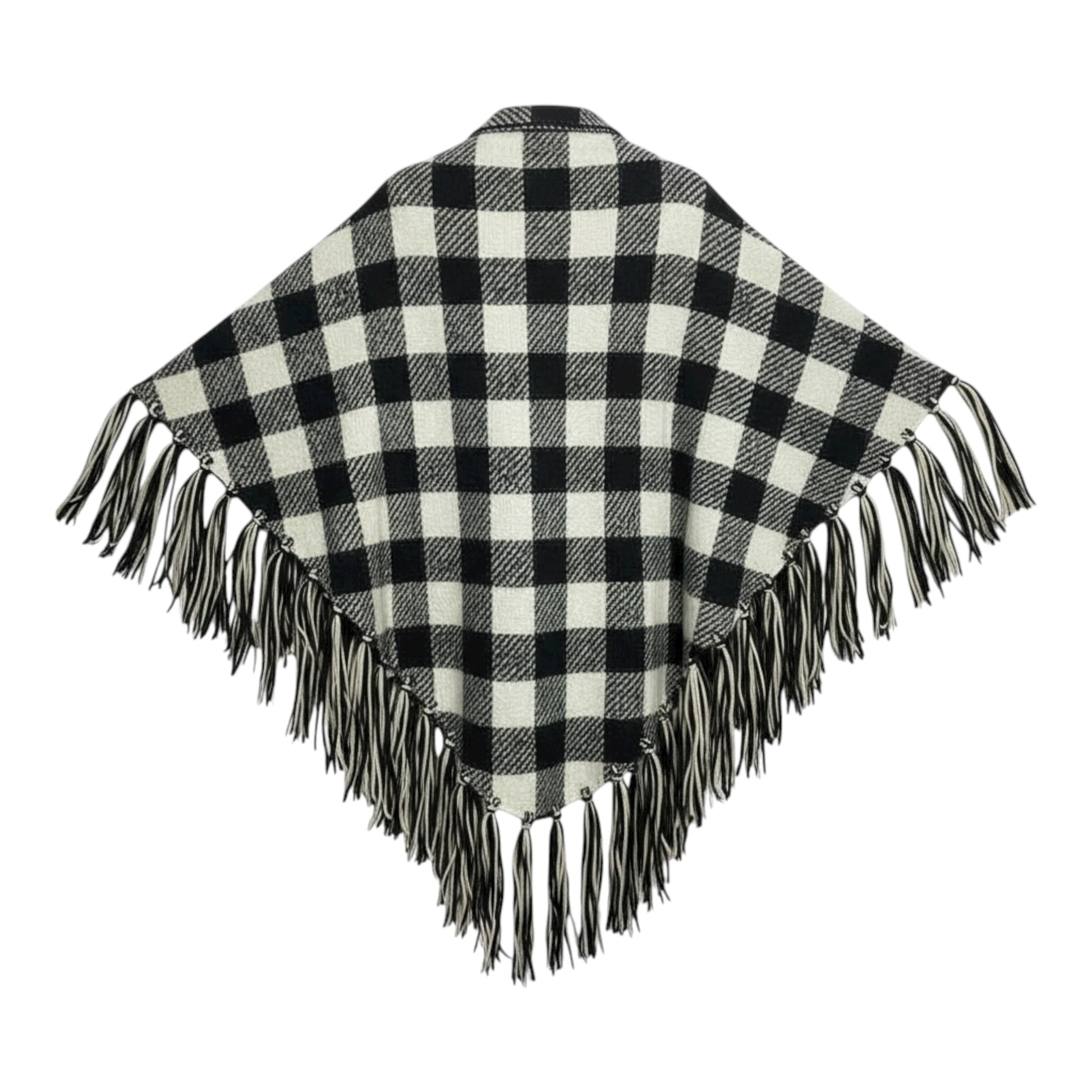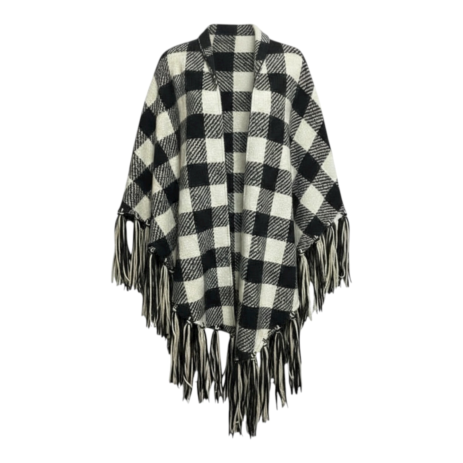 • Design: The garment has a large buffalo check or plaid pattern in black and white. It is an open-front style, similar to a ruana or wrap.