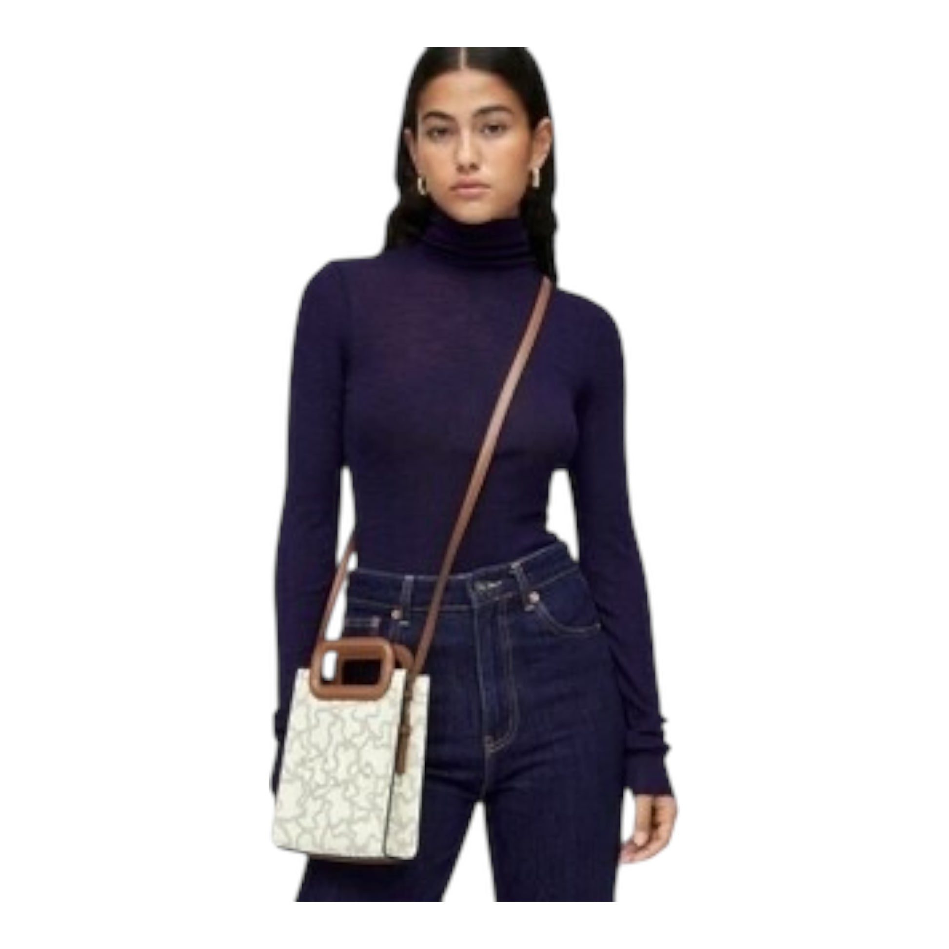 Mini TOUS Kaos Icon canvas handbag with beige and gray Kaos print and synthetic leather trim. Magnetic button closure. Adjustable and removable shoulder strap and fixed handles. Measurements (height x width x depth): 20 x 16 x 7 cm.