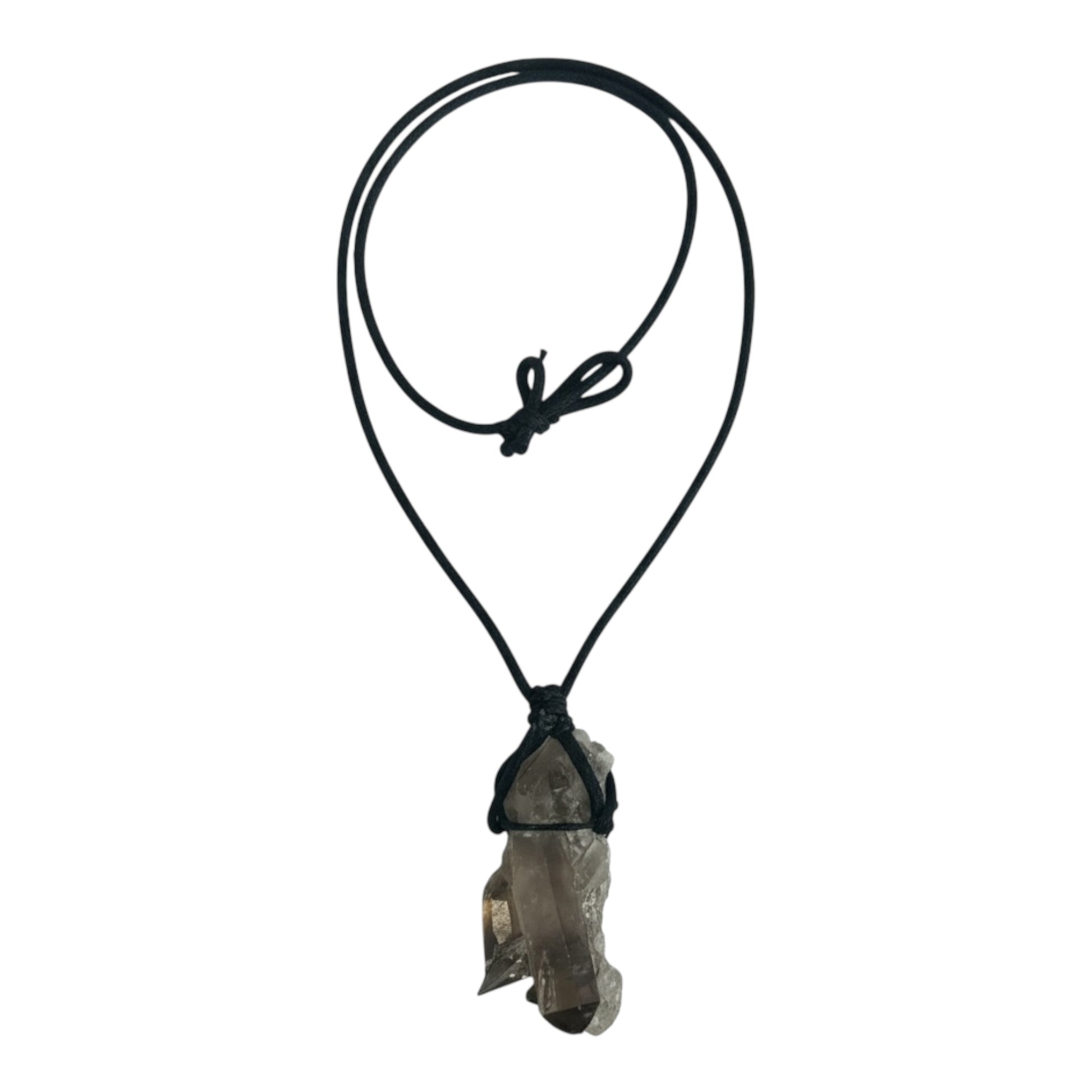 • Pendant: The pendant is a raw, unpolished crystal point, likely smoky quartz. It is held in place by black cords knotted around it.