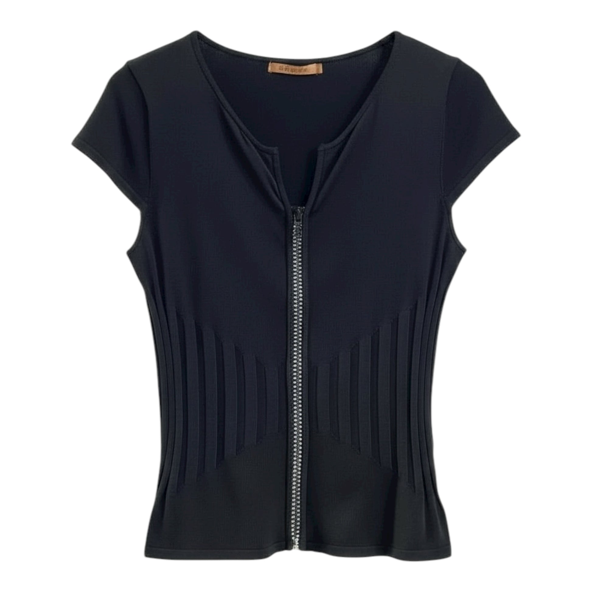 black short-sleeve top with chunky functional rhinestone zipper down centre, ribbed at hips