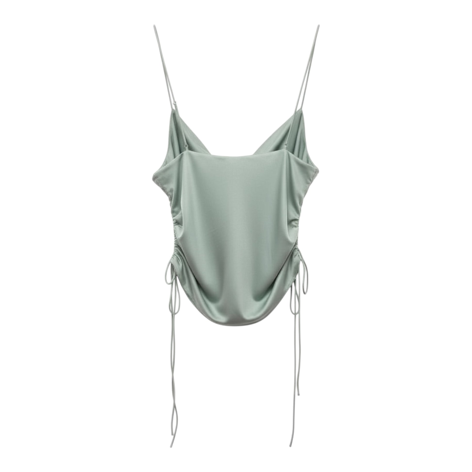 light green satin tank top with a cowl neckline and spaghetti straps. It has adjustable drawstrings on the sides that create a ruched effect.