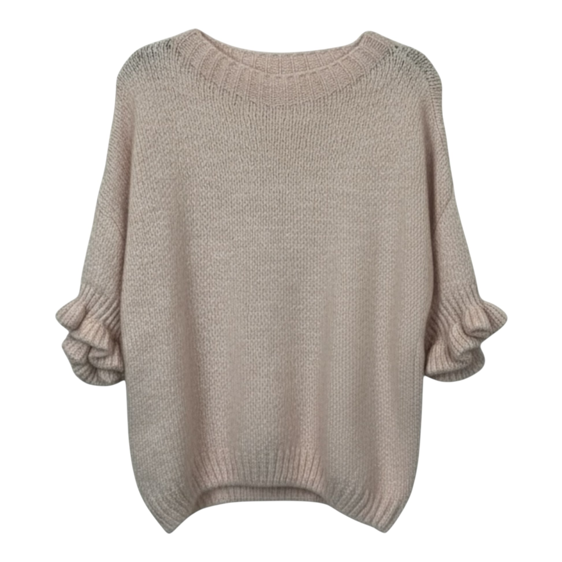 light pink, knitted garment with three-quarter length sleeves and ruffled cuffs. It features a loose, oversized fit and a rounded neckline. The knit appears soft and slightly fuzzy, suggesting a cozy texture. The bottom hem is rounded