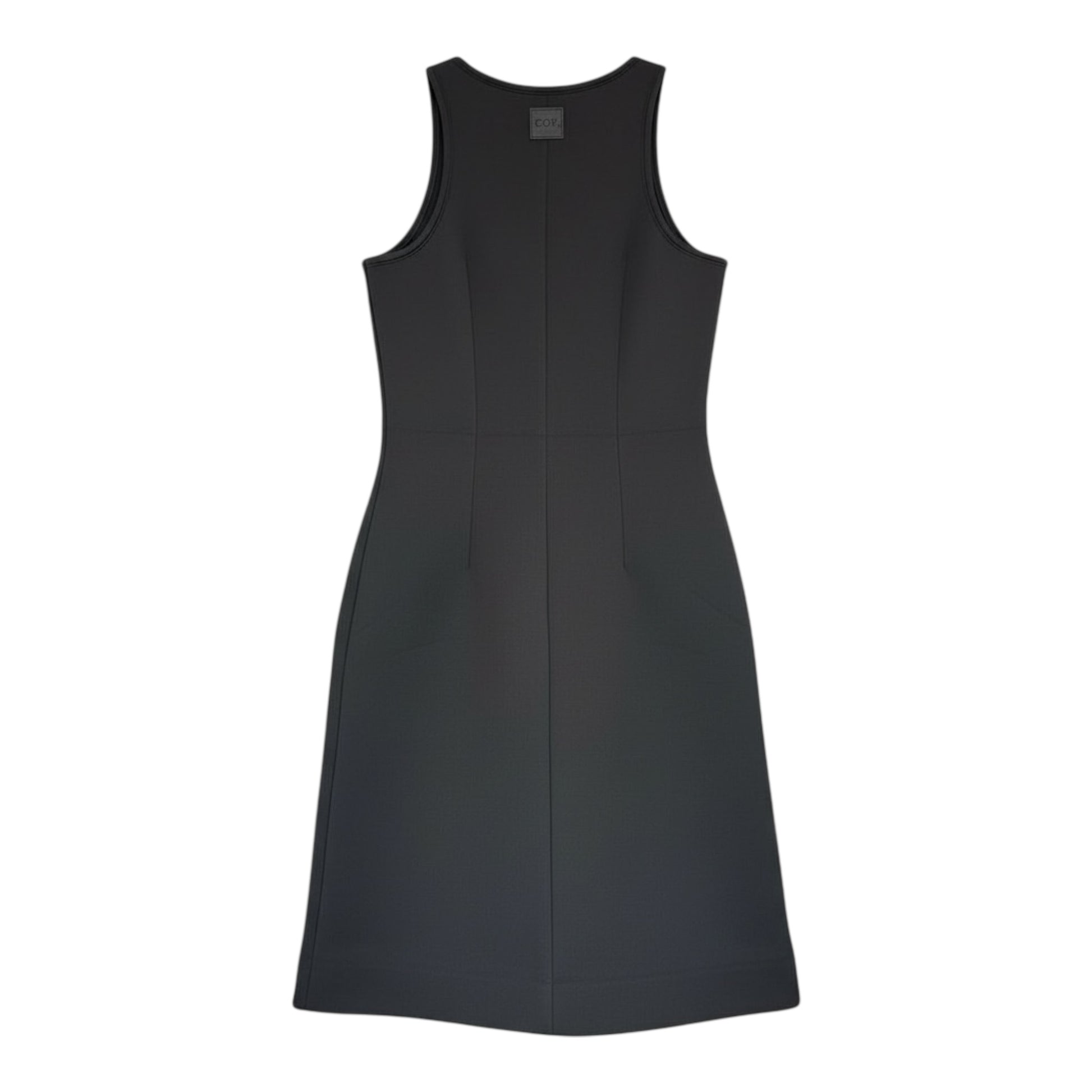 • Style: The dress features a high, round neckline and a fitted bodice that transitions into a flared, A-line skirt, black