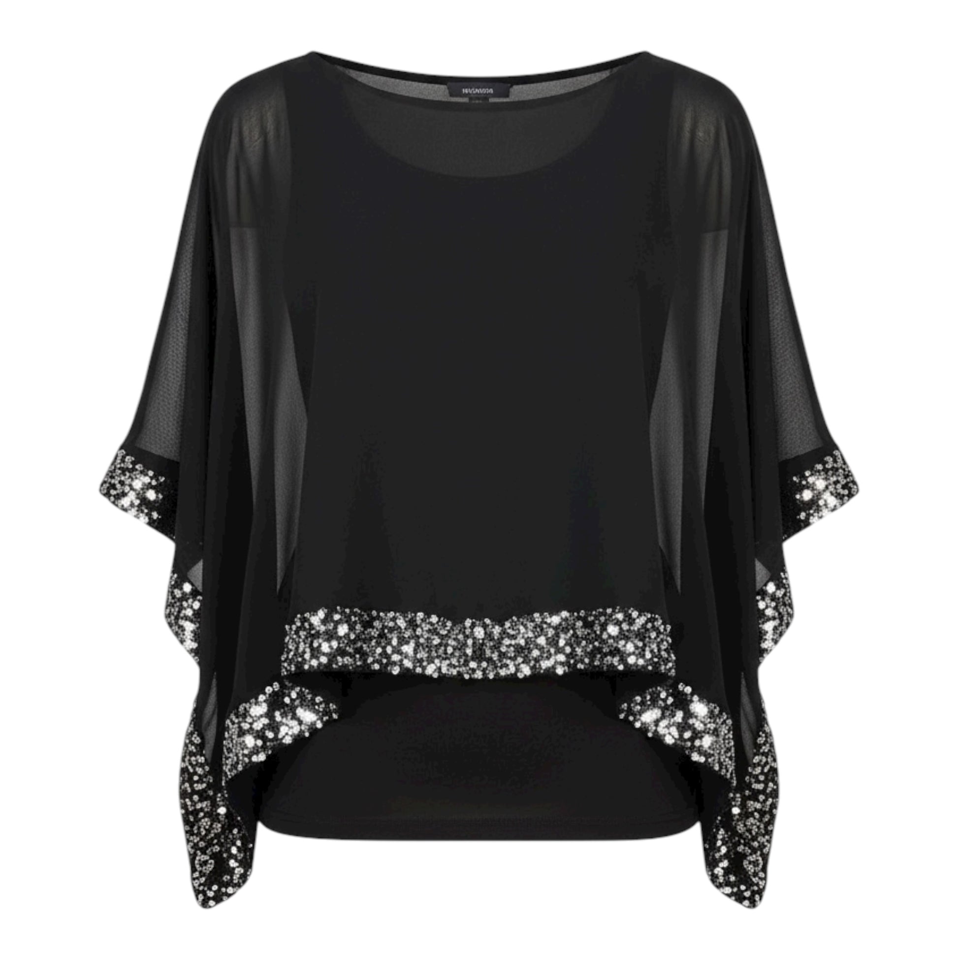 The top is a black, loose-fitting garment with sequin details. Top with a cape-like overlay. Peek a boo shoulder detail