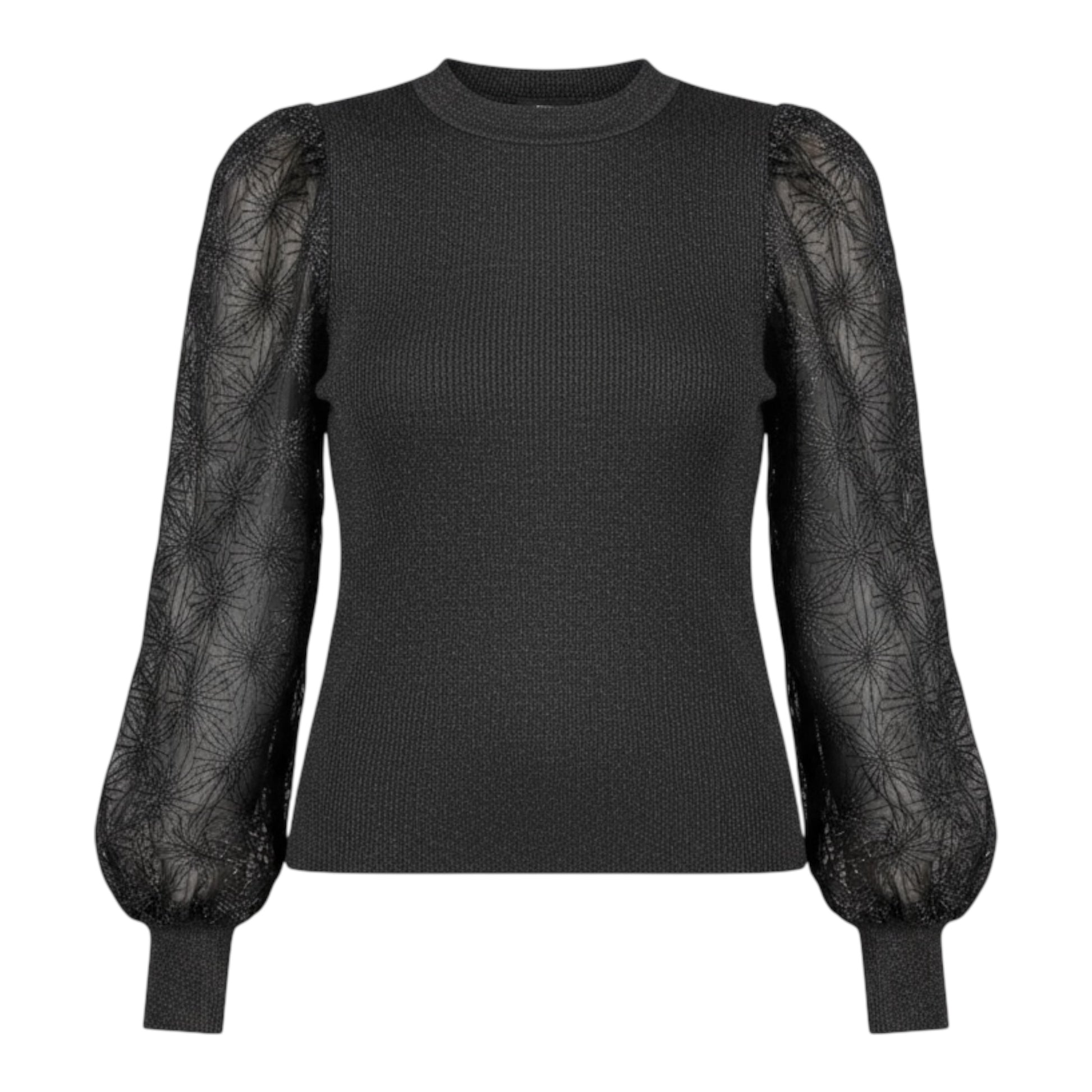 Colour: Black ribbed knit bodice, shimmer finish, embroidered mesh sleeves, sequin detail long sleeve, bishop sleeve, mock neck 21in length from shoulder to hem viscose/nylon