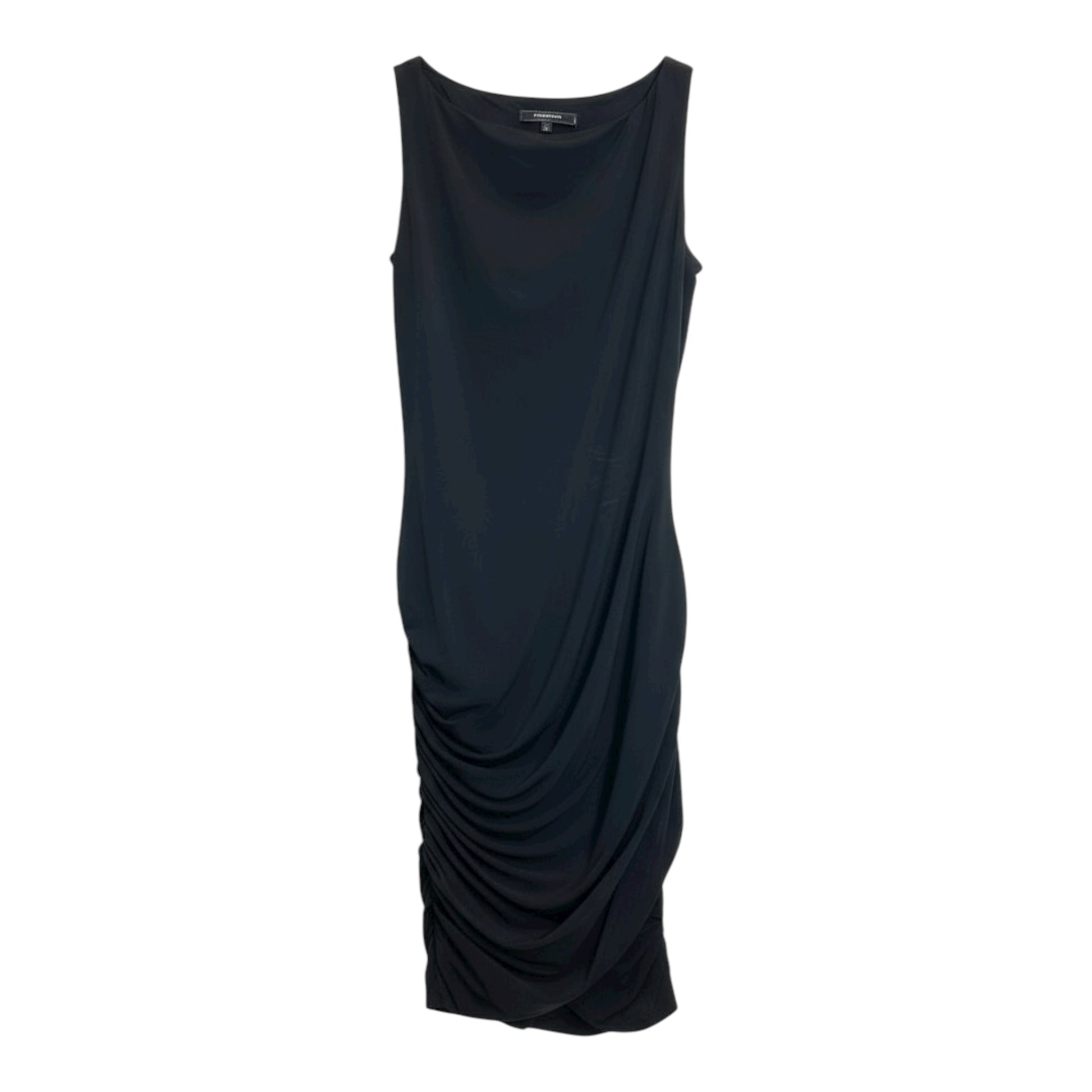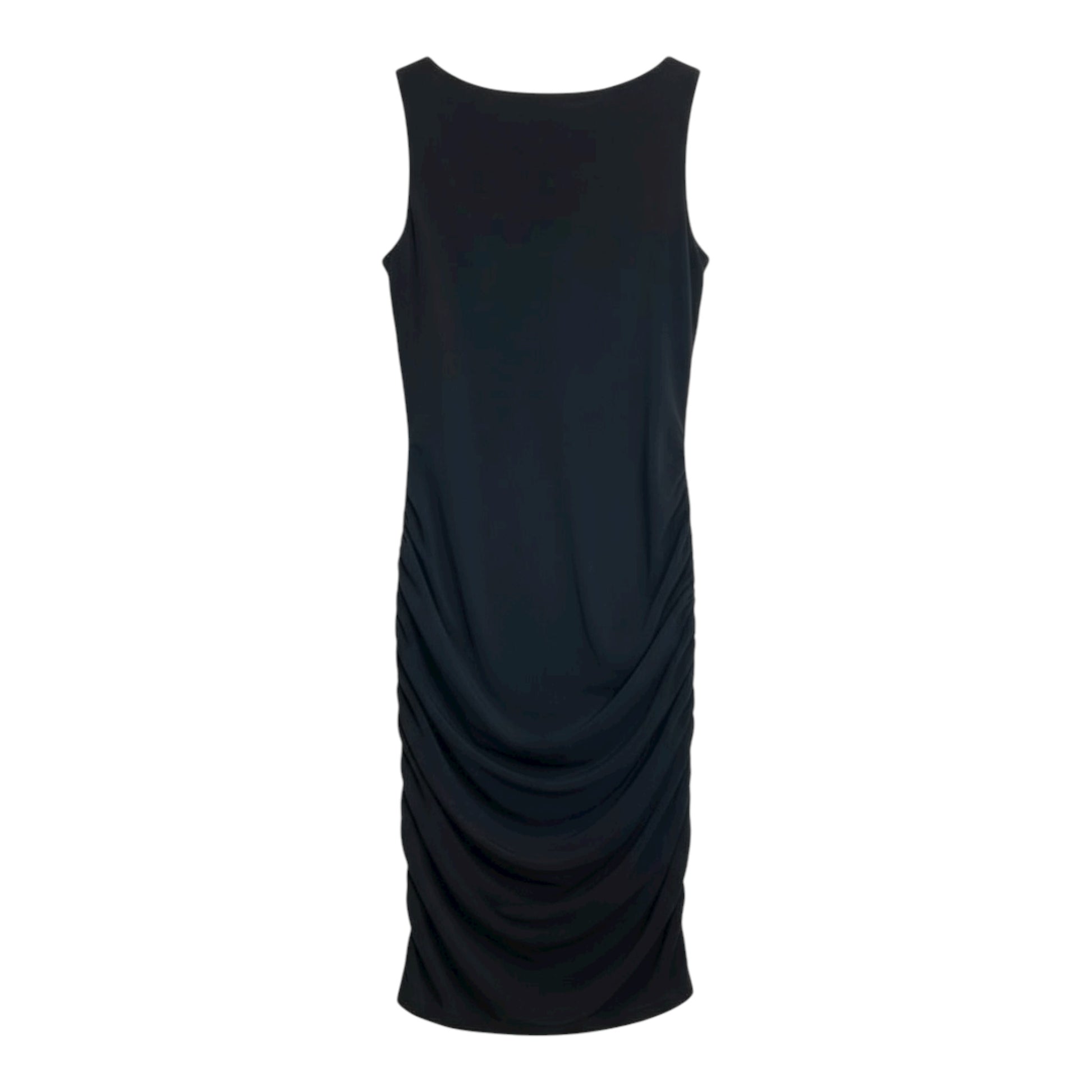 Black mini dress with a draped or cowl neckline and a ruched or draped skirt, creating an asymmetrical hemline. It is made from a stretchy material, likely a jersey or viscose blend, and is a pull-on style. The dress is black and sleeveless, with a mid-length cut.