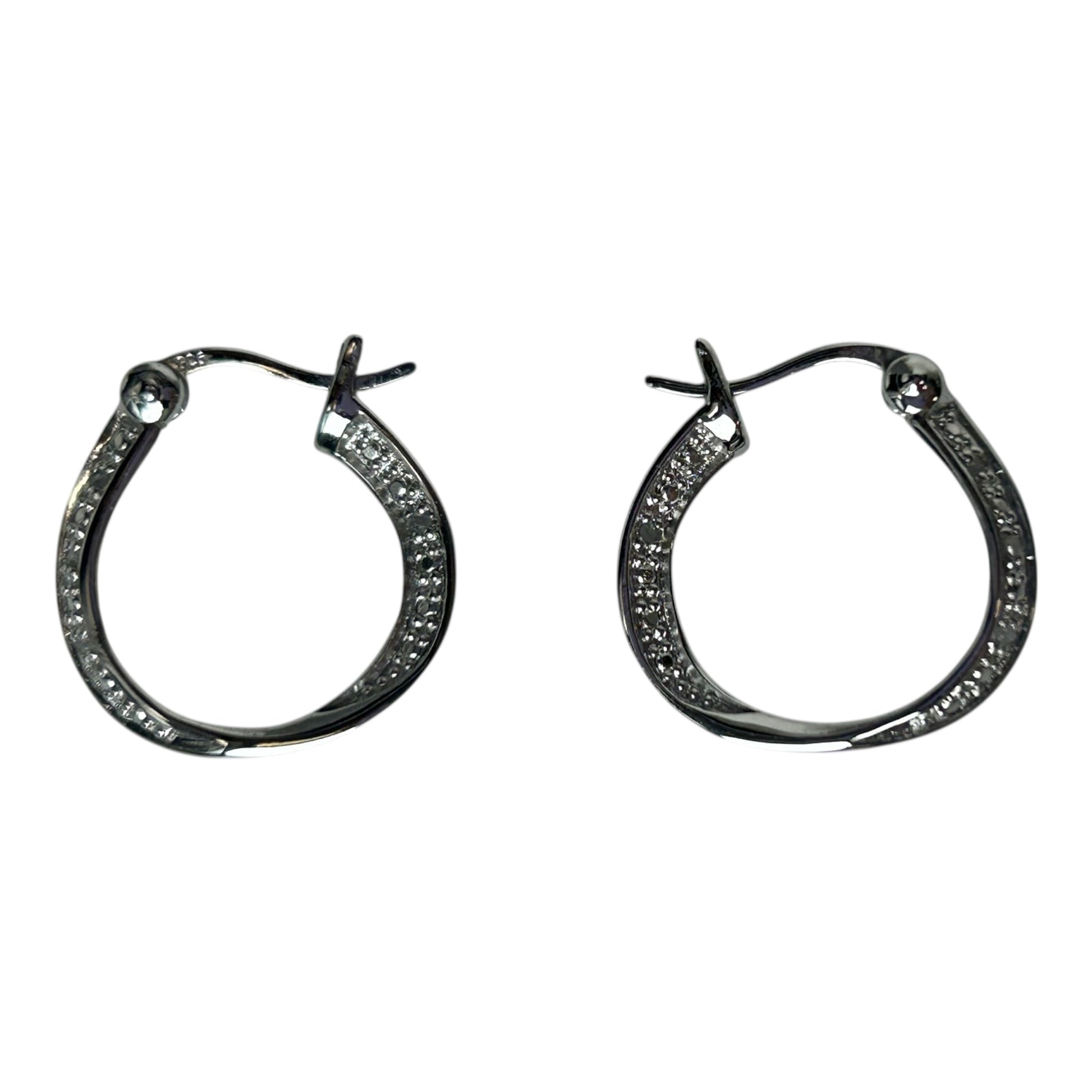 This is a pair of diamond and sterling silver hoop earrings, with box
