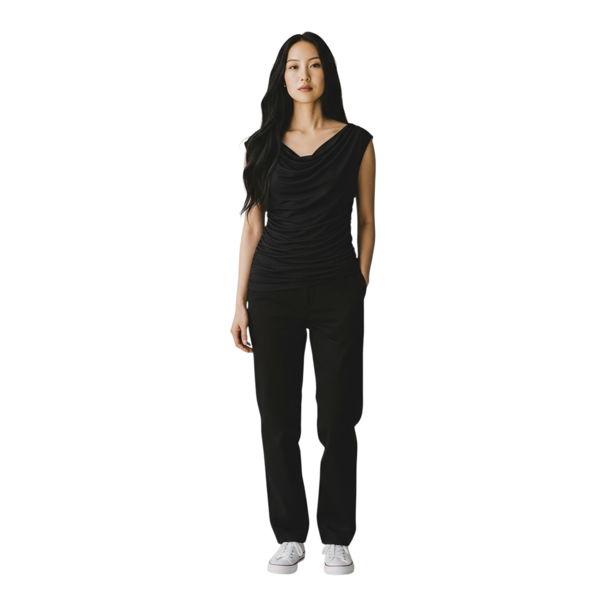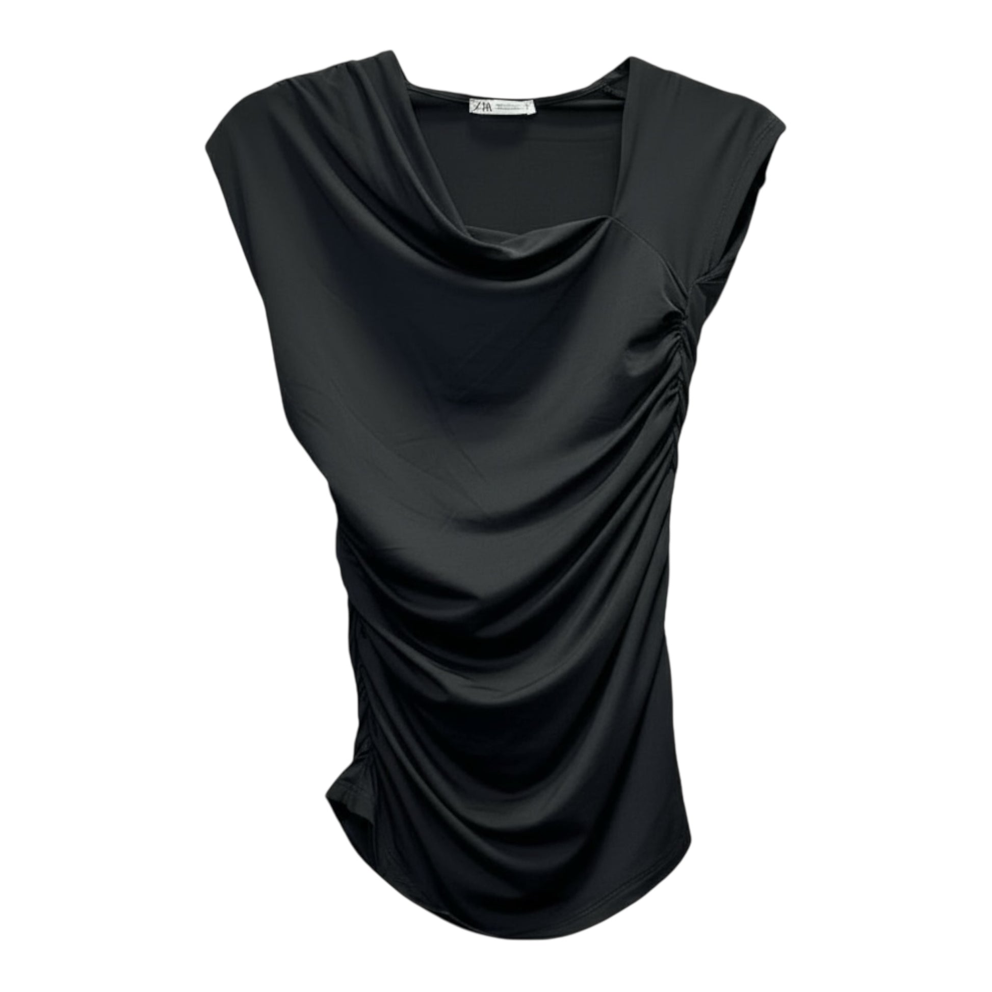 black top with a draped or cowl neckline, also known as a waterfall neckline. It has short cap sleeves and a regular fit. The top features gathered or ruched detailing on the right side, creating an asymmetric hemline.