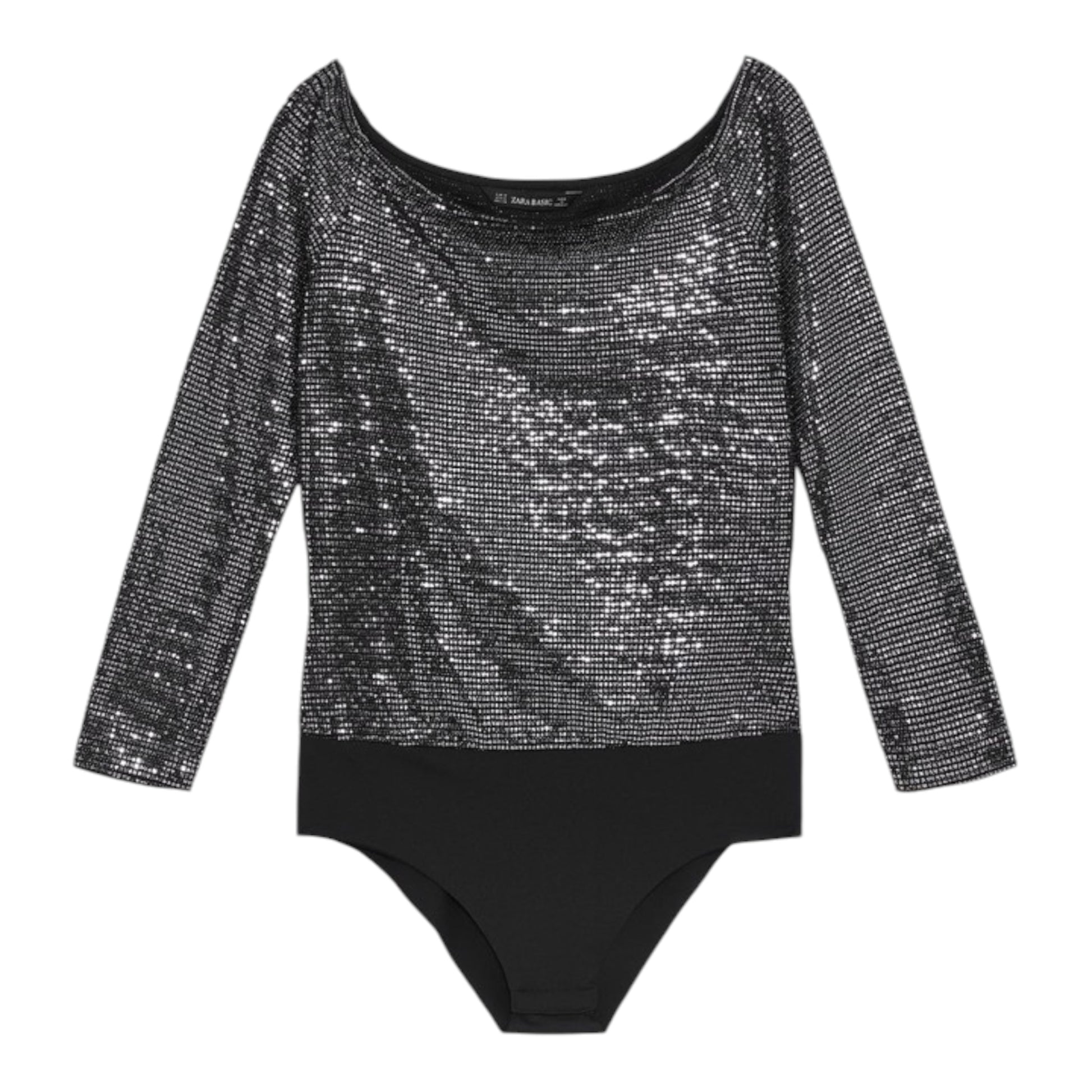 Long sleeve bodysuit with a wide neckline and snap-button fastening at the bottom.