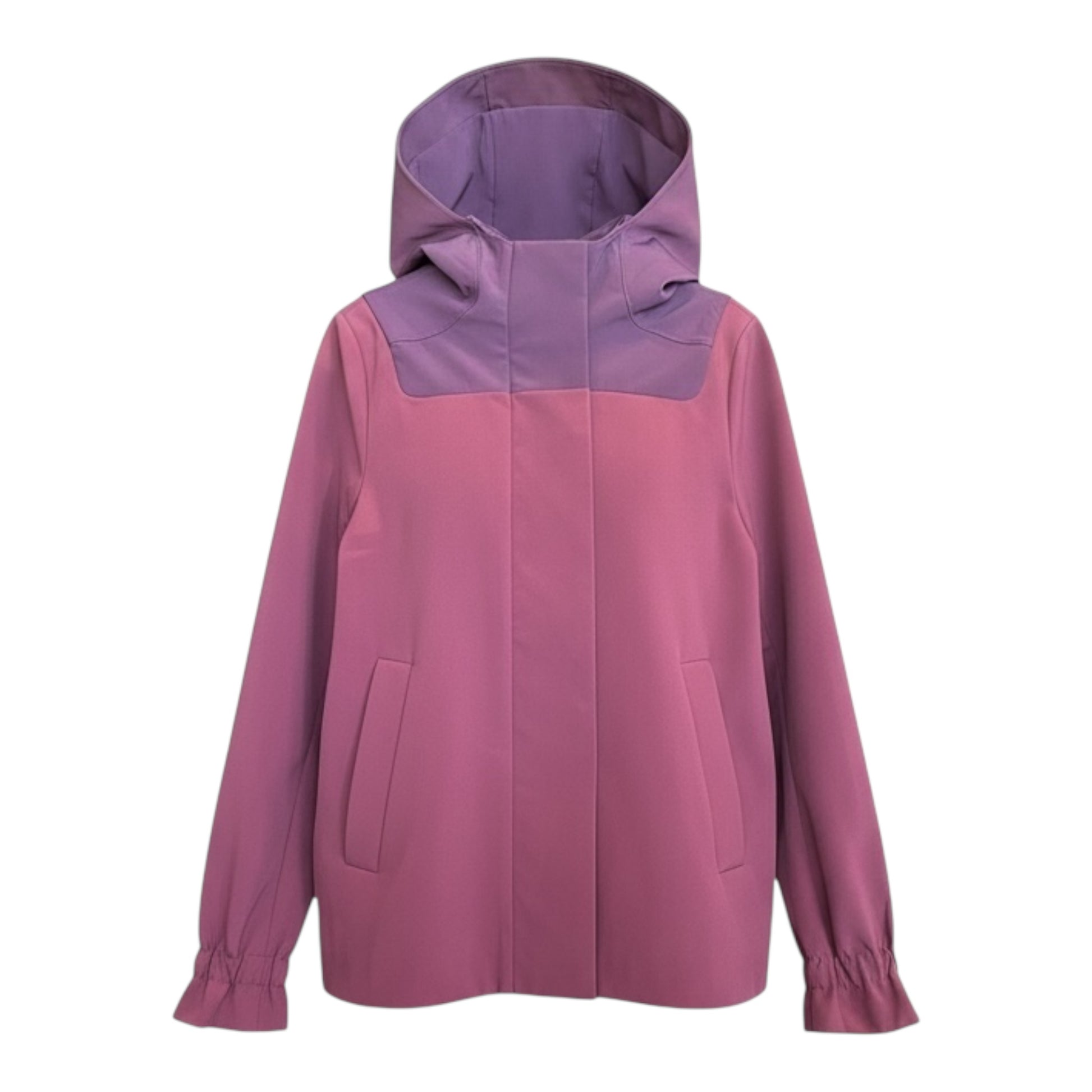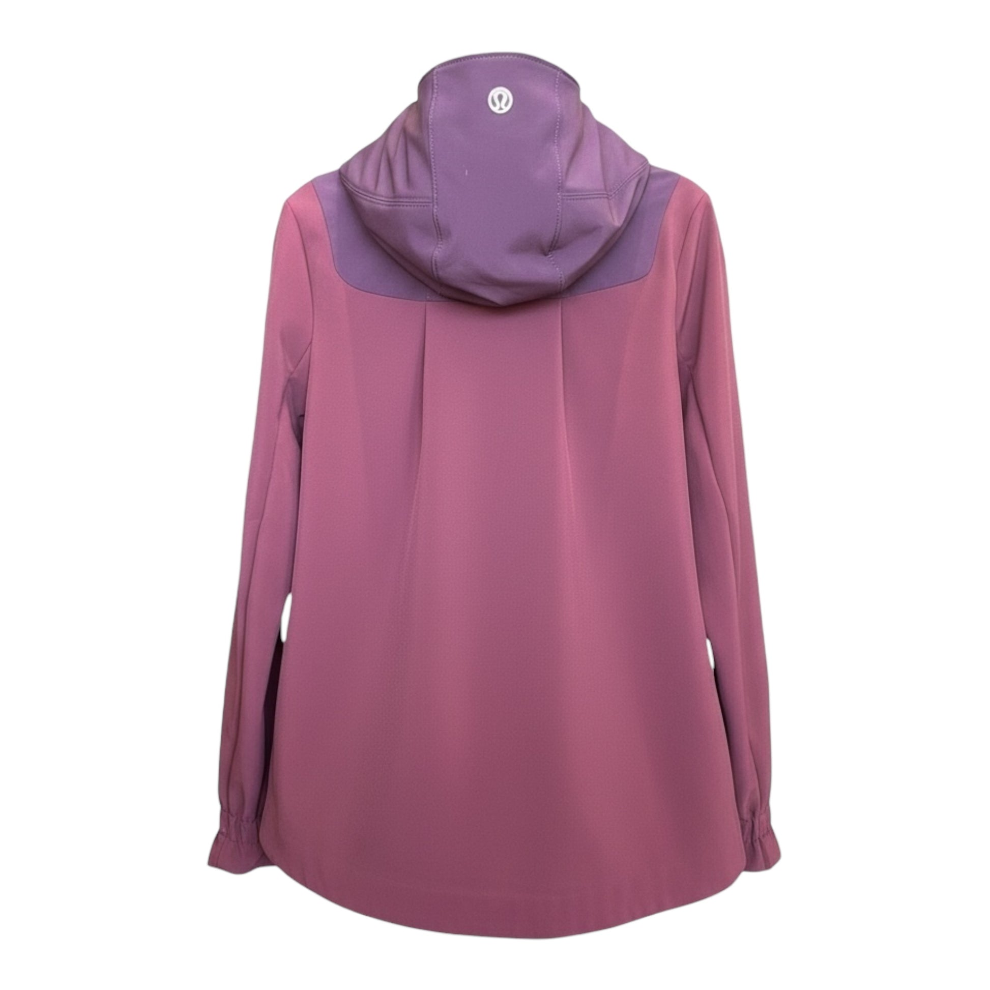 • Design: It features a contrasting purple section on the upper back/shoulder area and the hood.