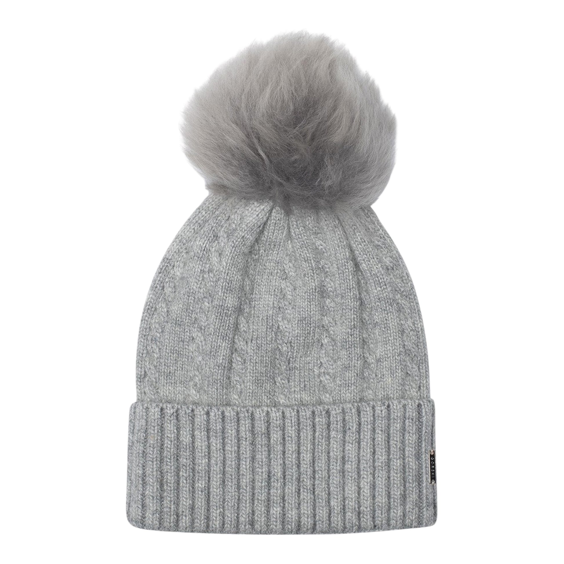 This knit hat with a Toscana shearling lamb pompom keeps you warm and stylish. Its soft, cozy design is perfect for cold days and adds a chic touch to any outfit.