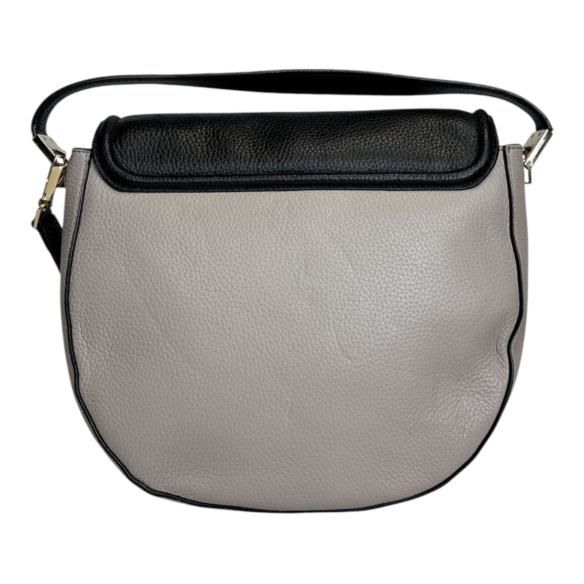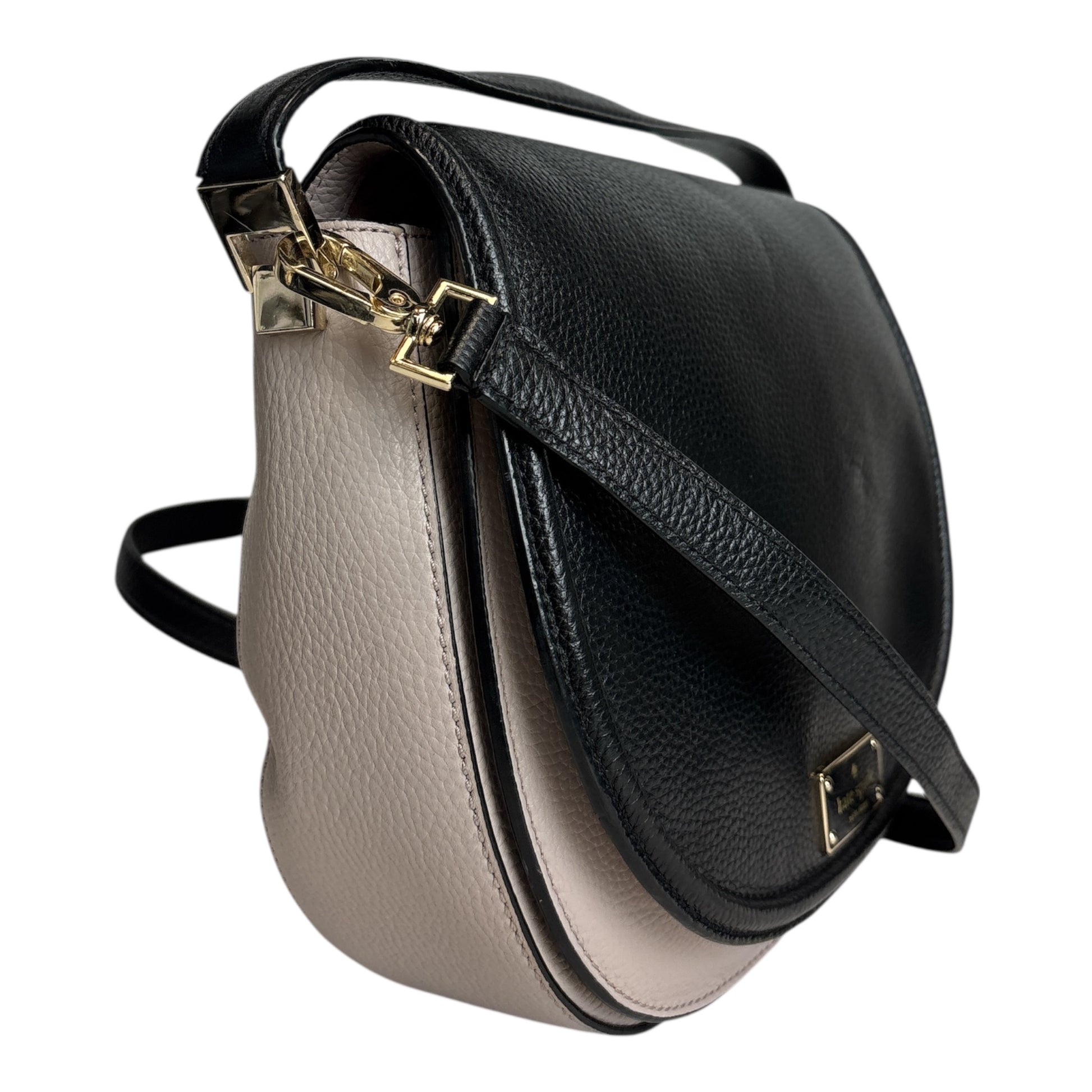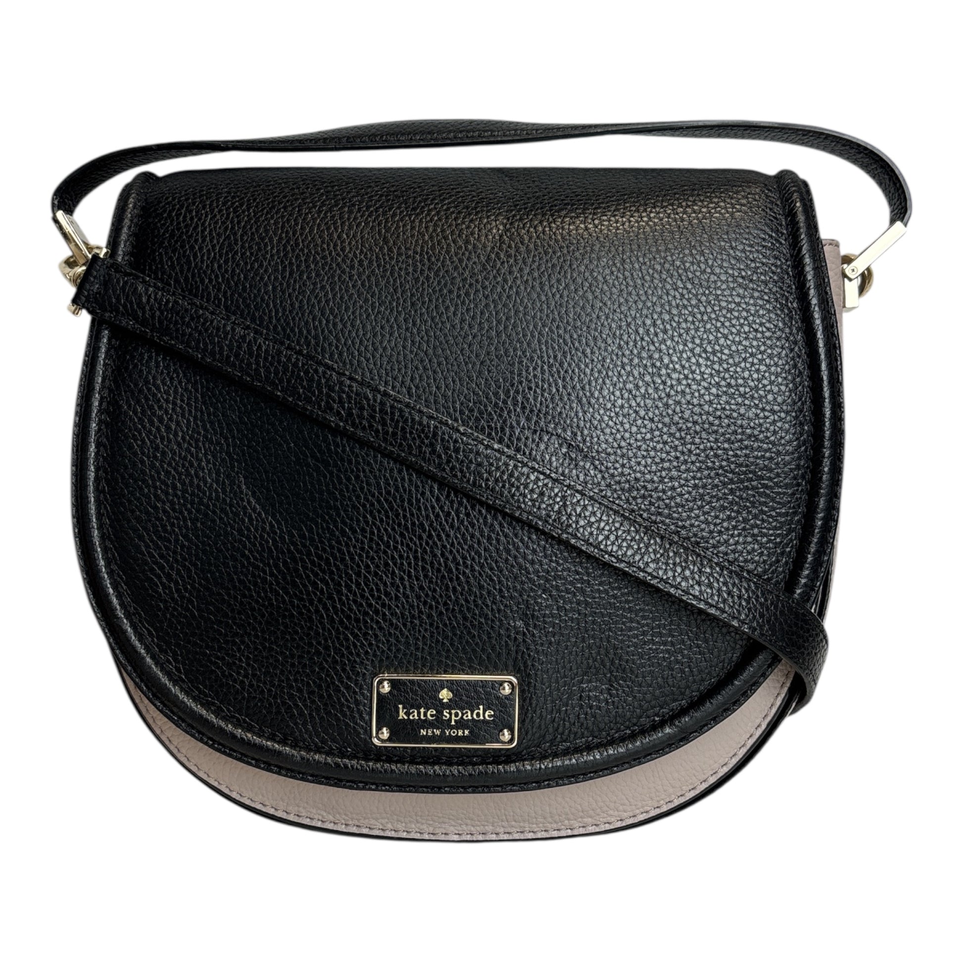 Pebbled leather bag has front flap with magnetic closure; Gold-toned hardware Adjustable shoulder strap with maximum drop of approx. 23 inches Front has embossed Kate Spade name plate Fabric lined interior features front full length slip pocket; Main compartment has 1 slip pocket