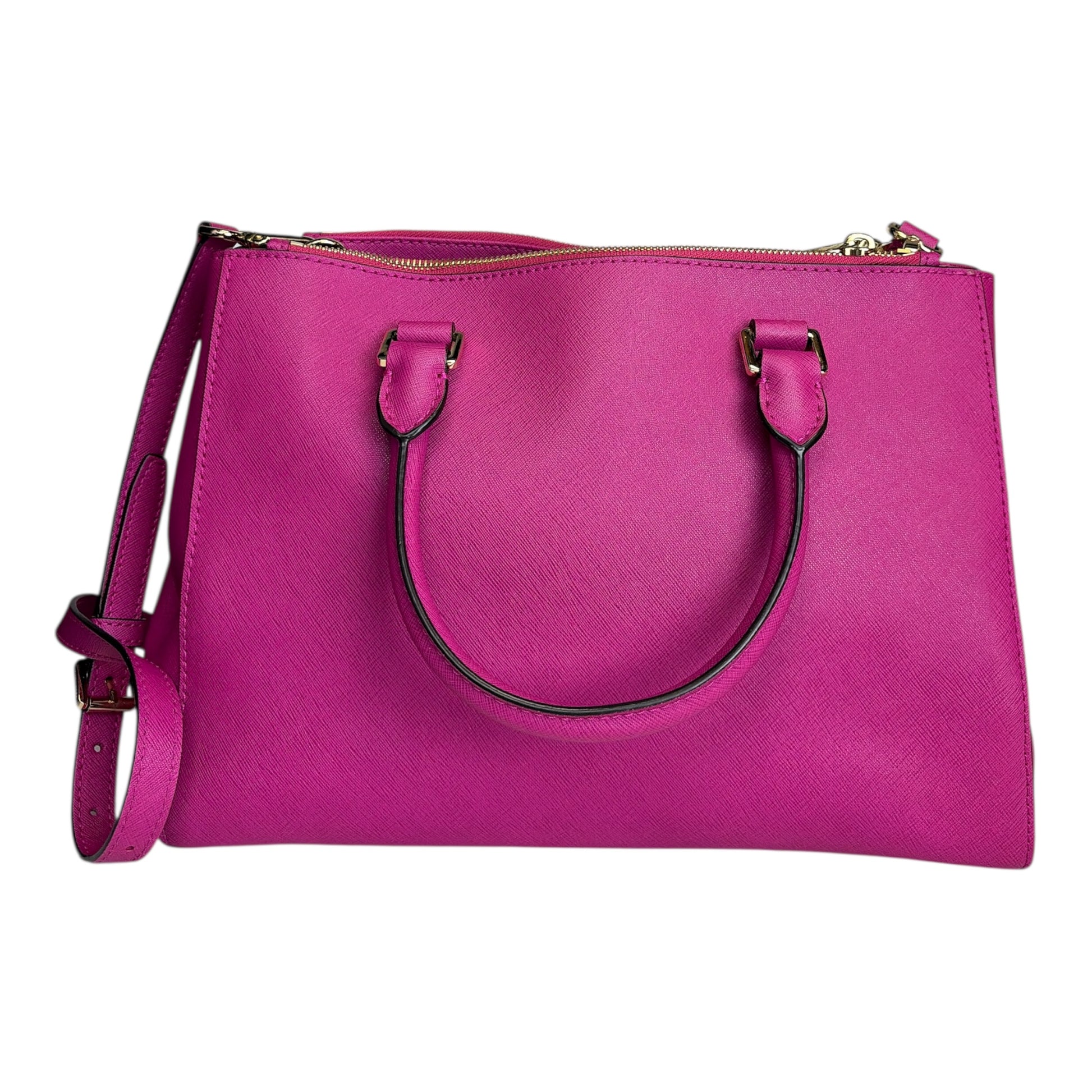 Saffiano leather Double top handles with 4" drop; adjustable, detachable long strap with 20" drop Magnetic snap closure Logo medallion key chain; gold-tone hardware Interior features 2 side zip compartments, open compartment with zip pocket, 4 slip pockets and key fob 13" W x 9" H x 5" D