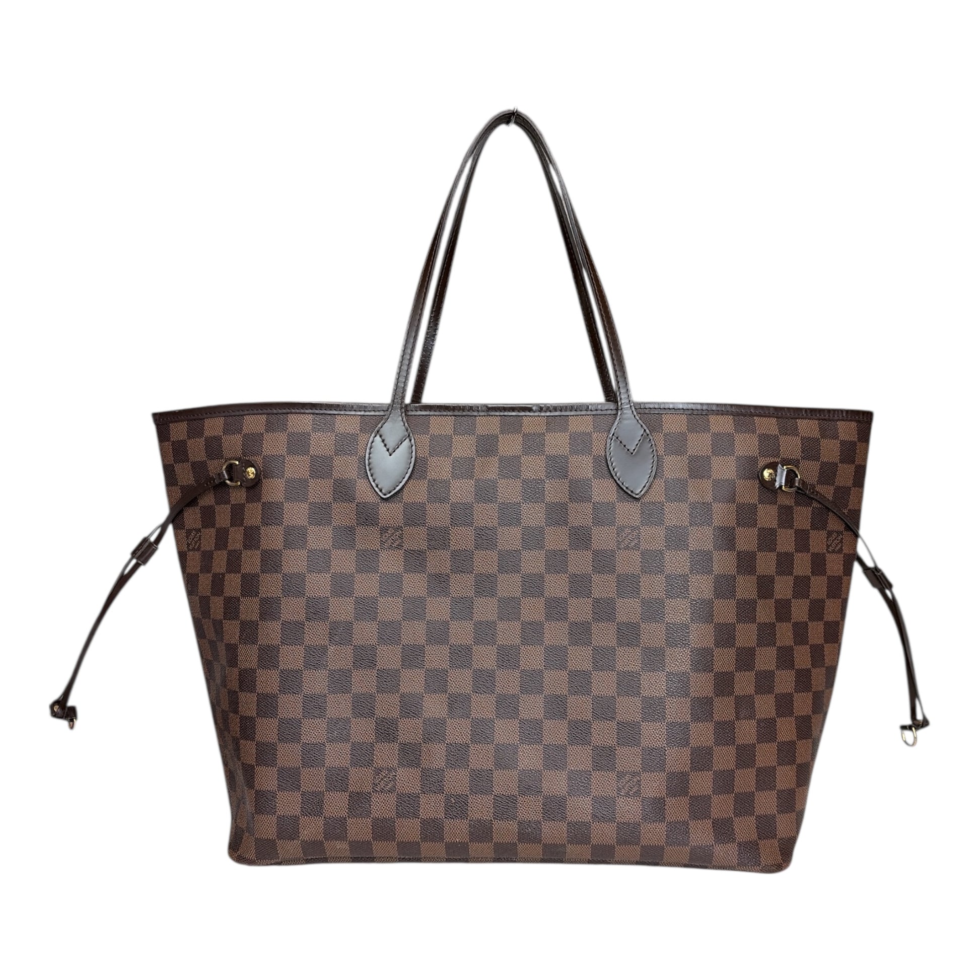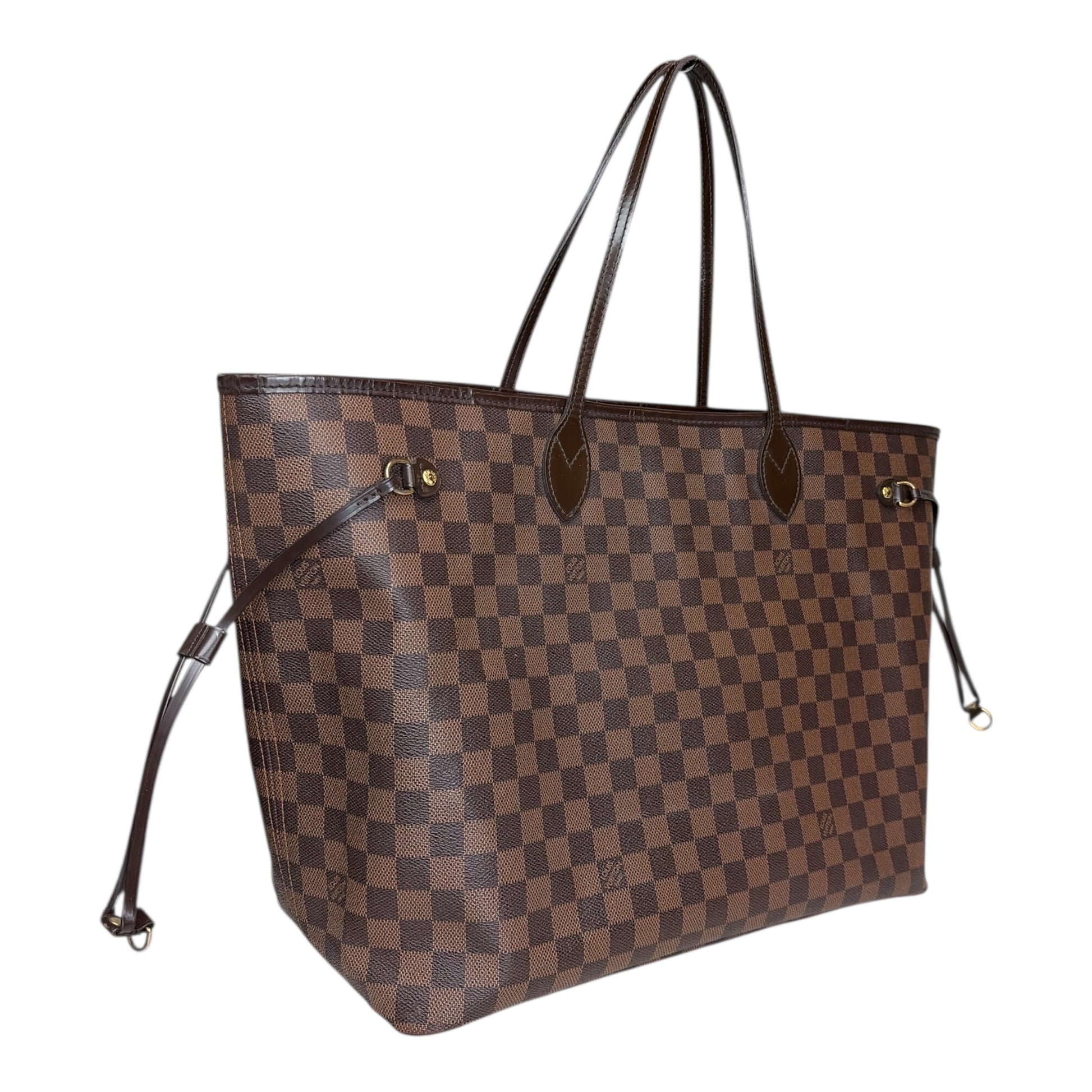 The Neverfull GM tote unites timeless design with heritage details. Elegant in Damier Ebene canvas with natural cowhide trim, it is roomy but not bulky, with side laces that cinch for a sleek allure or loosen for a casual look. Slim, comfortable handles slip easily over the shoulder or arm. Lined in colorful textile