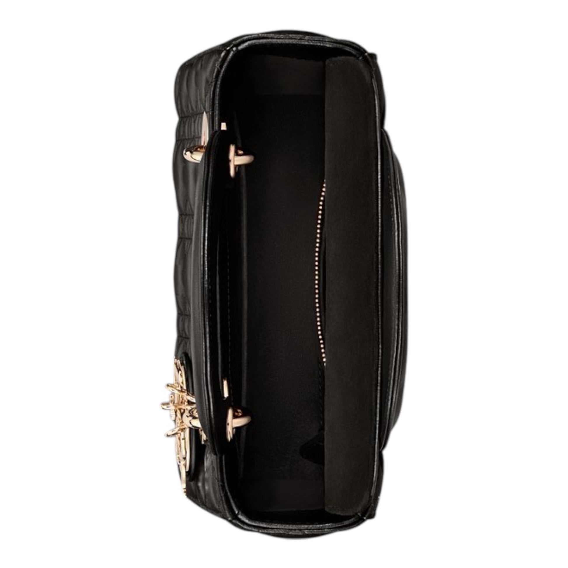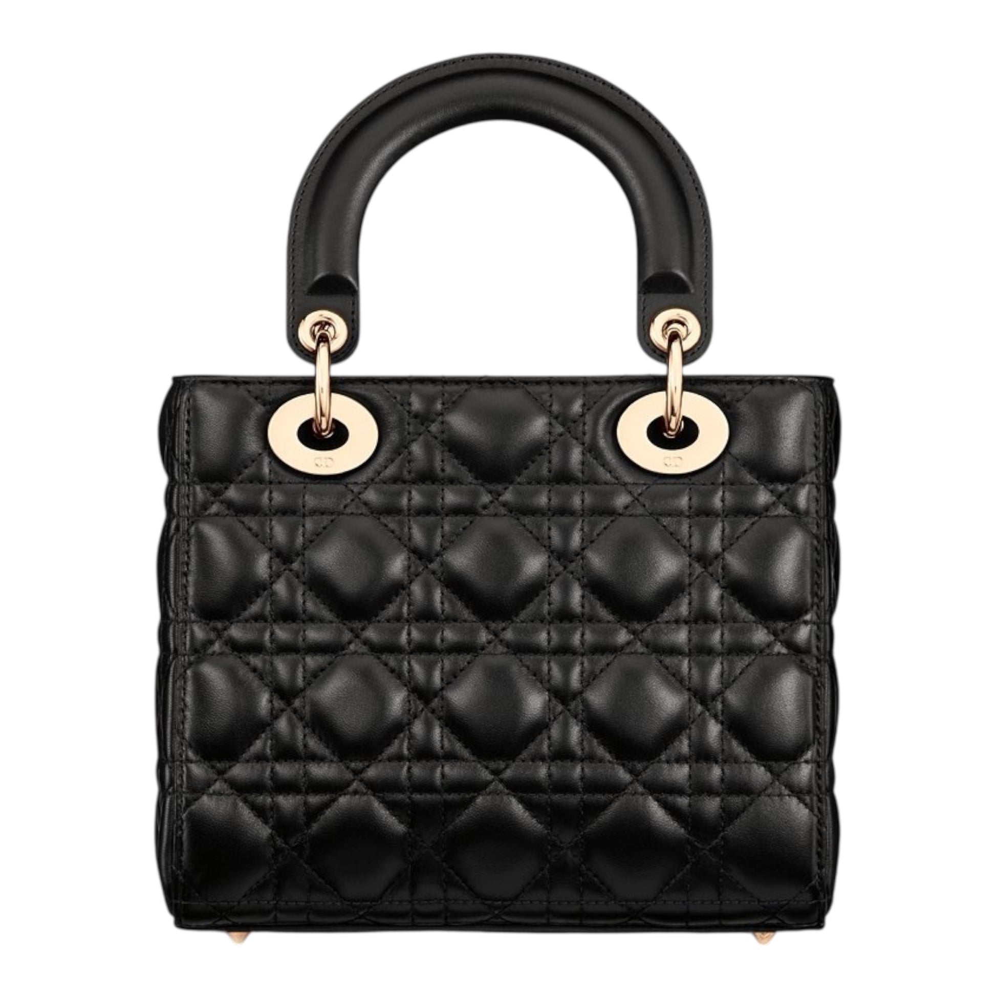 The Lady Dior My ABCDior bag epitomizes Dior's vision of elegance and beauty. Sleek and refined, the timeless style is crafted in black lambskin with Cannage stitching, creating the instantly recognizable quilted texture. Pale gold-finish metal D.I.O.R. charms offer elegant appeal. Featuring a shoulder strap that can be personalized with badges, the small, unique design may be carried by hand or worn crossbody.